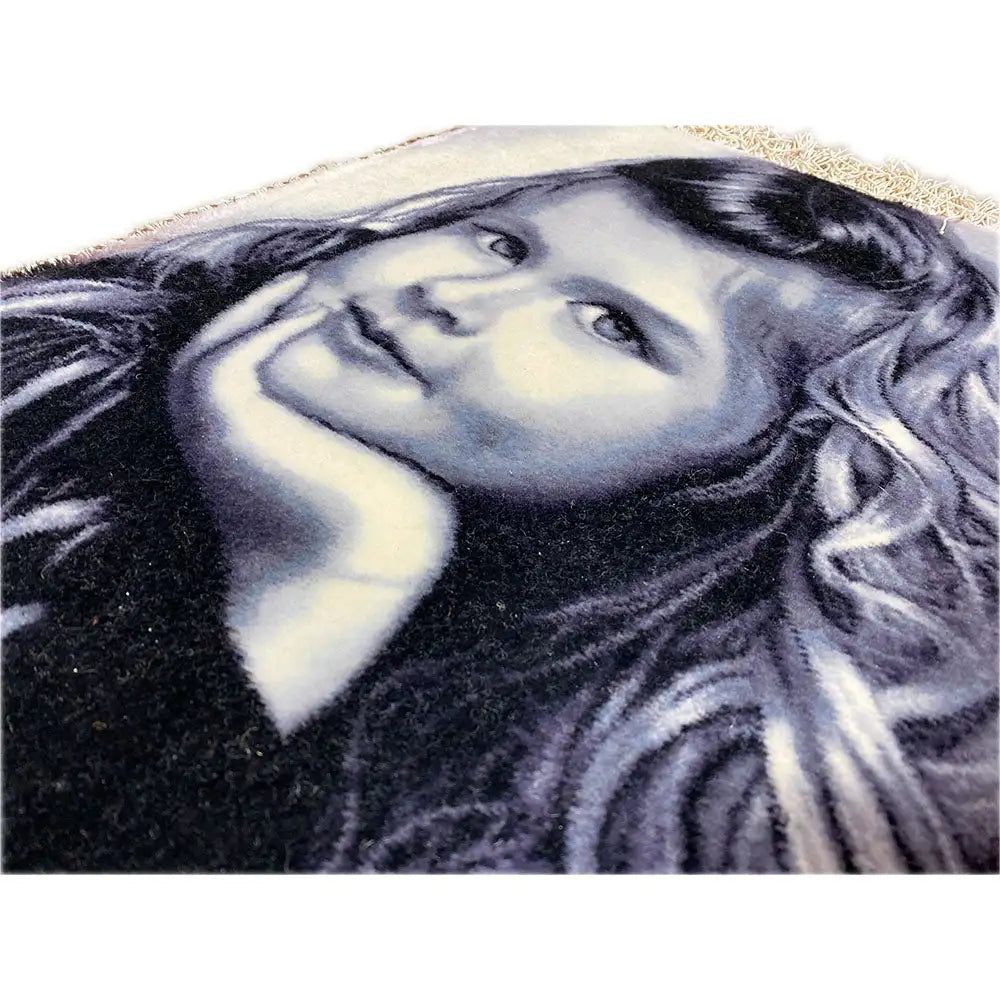 Este tapete de parede único, feito à mão com nós, no tamanho 55x35cm, é confeccionado com uma mistura nobre de lã e seda. Apresenta um retrato figurativo de uma rapariga em preto e branco intemporal e está rodeado por uma moldura clássica que o transforma numa obra de arte pronta a pendurar. Esta peça excecional combina a fina arte da fabricação de tapetes com expressão artística, sendo uma decoração elegante e pessoal para qualquer casa.