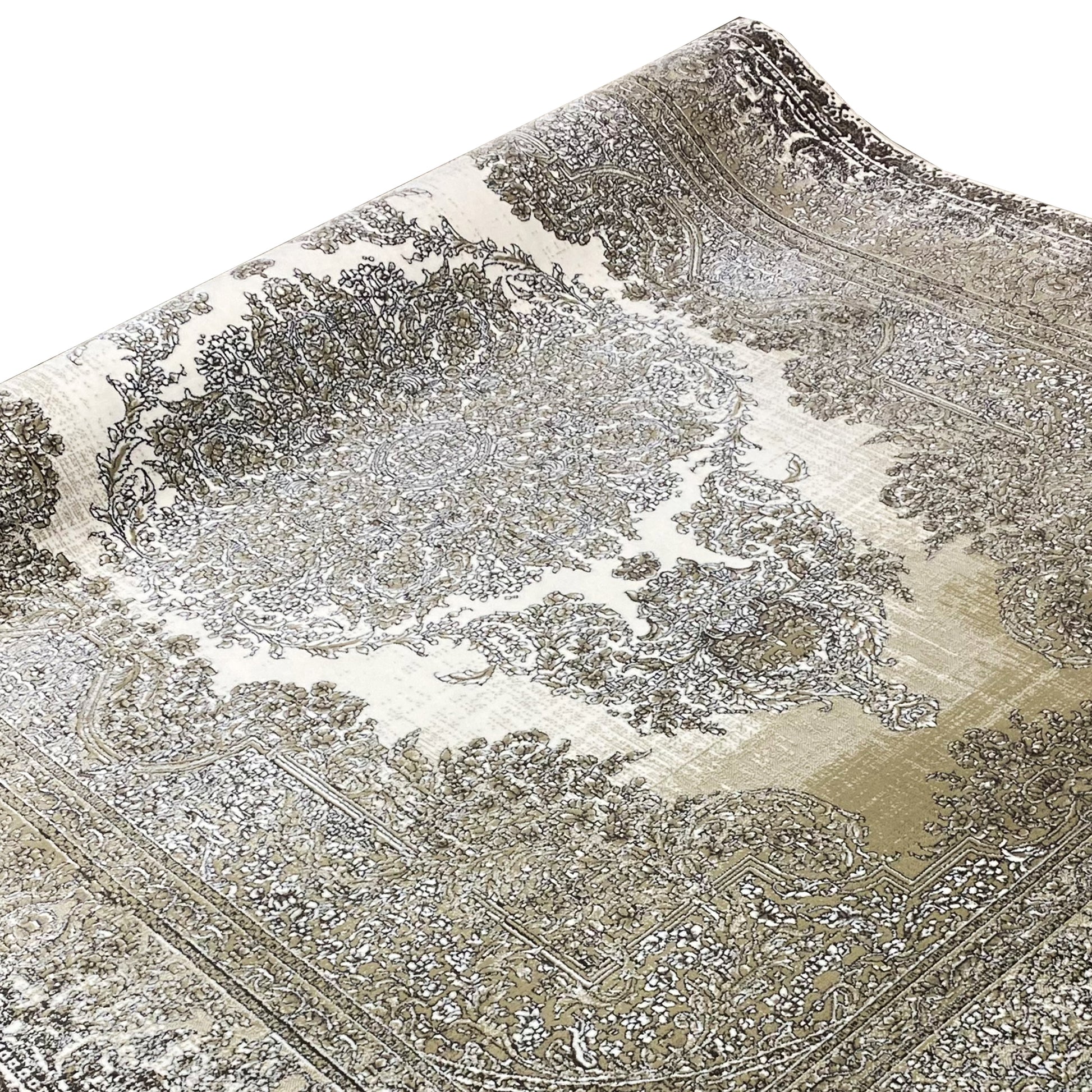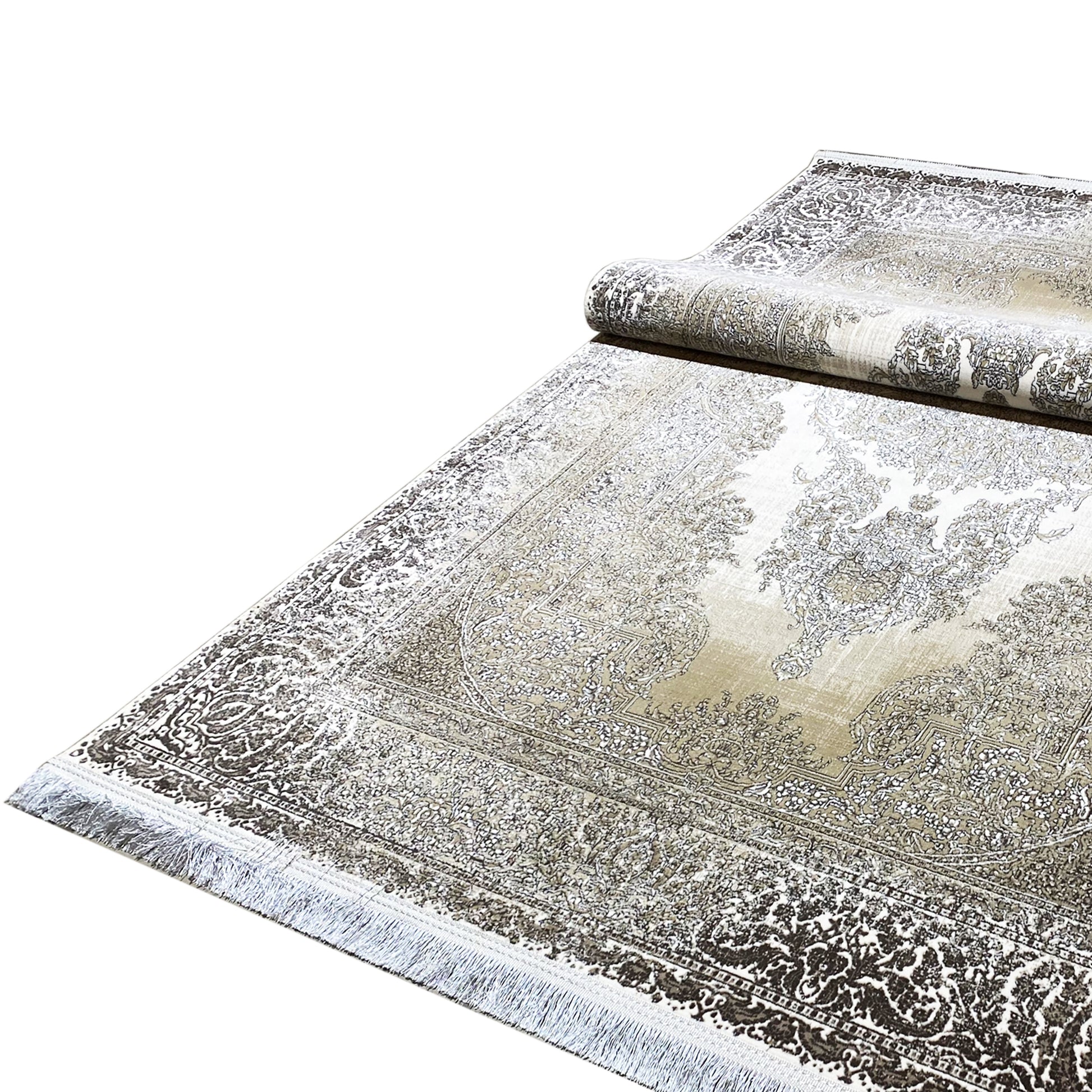 Dê à sua casa um toque de elegância intemporal com este tapete clássico. O padrão persa tradicional, com um medalhão central artístico e uma borda decorada, cria um ponto focal luxuoso. Com as suas dimensões de 170x240cm, é perfeito para valorizar a sala de estar ou o quarto. Fabricado em acrílico resistente e fácil de cuidar, este tapete creme-prateado combina estética e funcionalidade, integrando-se perfeitamente em estilos de decoração tradicionais ou modernos.