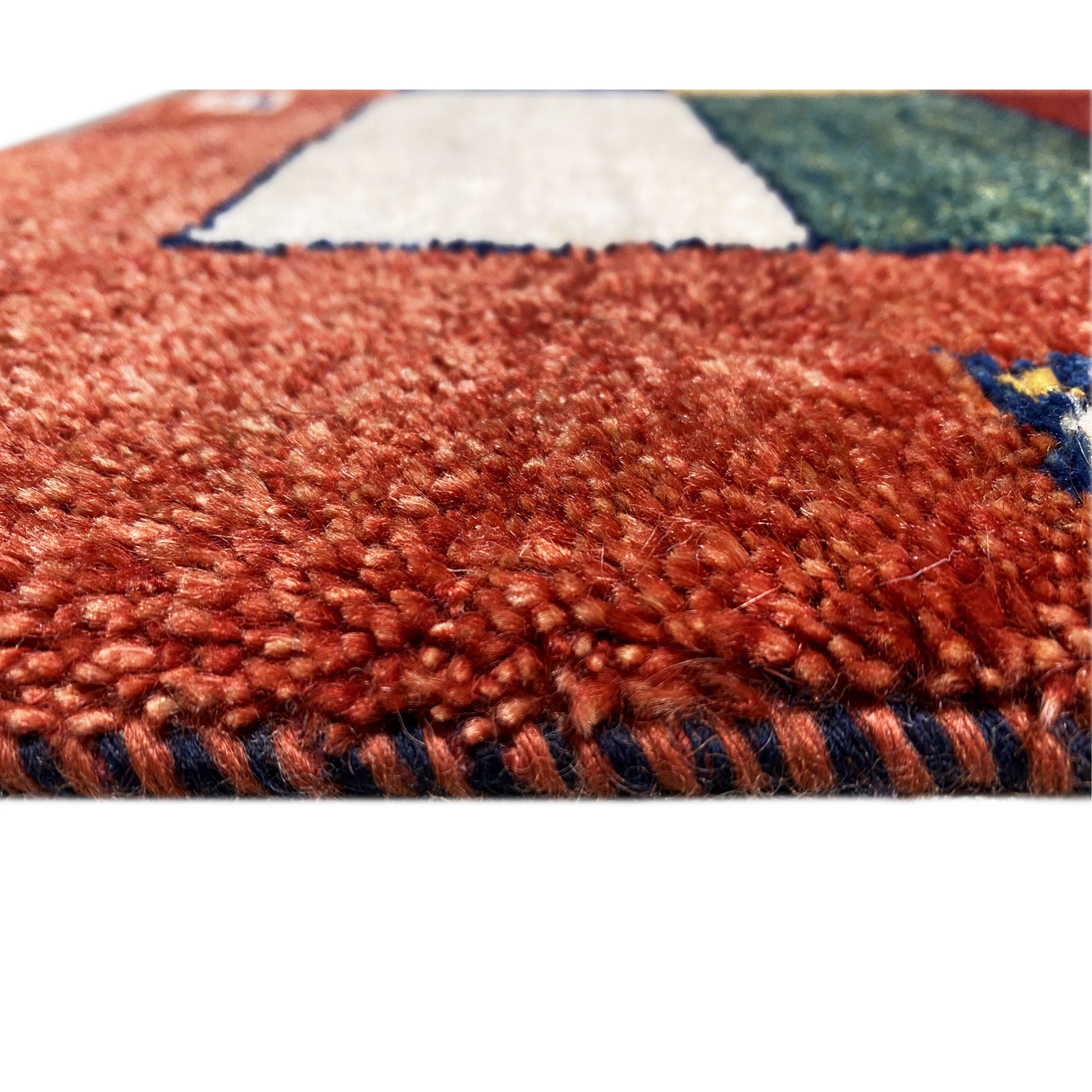 Este corredor Gabbeh expressivo e feito à mão, com o tamanho de 139x68cm, é confeccionado em lã fiada à mão e tingida com plantas. O seu design vibrante apresenta um patchwork de blocos retangulares coloridos sobre um fundo vermelho dominante, emoldurado por uma borda com pequenos símbolos. Ideal para corredores ou espaços estreitos, este tapete confere a qualquer estilo de decoração moderno ou eclético um toque colorido e dinâmico, combinado com o calor natural e a durabilidade de um verdadeiro Gabbeh.