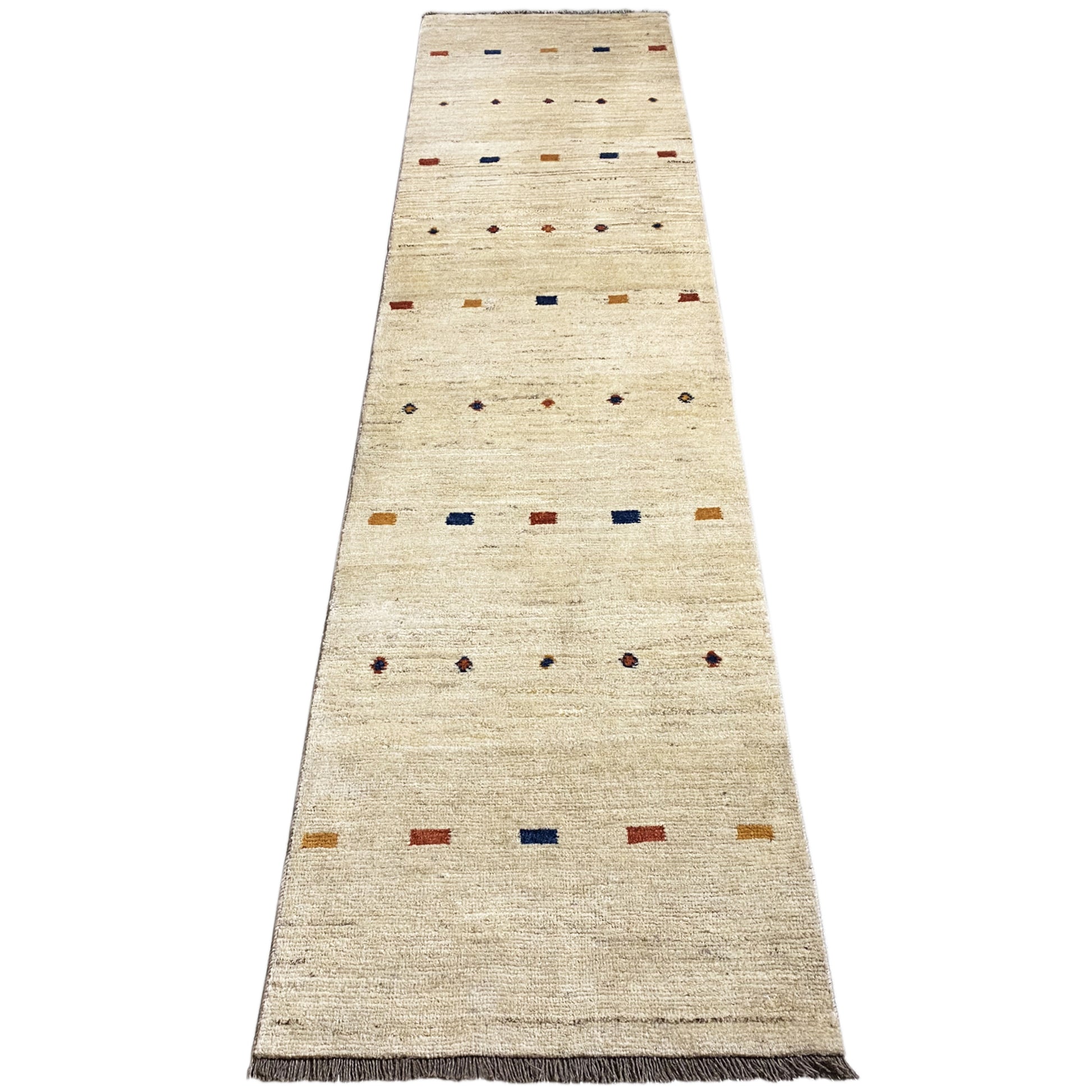 Este impressionante, corredor Gabbeh feito à mão, no generoso tamanho 279x69cm, é feito de lã fiada à mão, feita de lã tingida com plantas. O seu design minimalista sobre um fundo bege é complementado por discretos, animado com acentos coloridos na forma de pequenos pontos e motivos horizontais. Ideal para corredores longos ou estilos de decoração minimalistas, este corredor traz uma elegância tranquila e um calor natural à sua casa, enquanto simultaneamente encanta pela sua beleza simples.