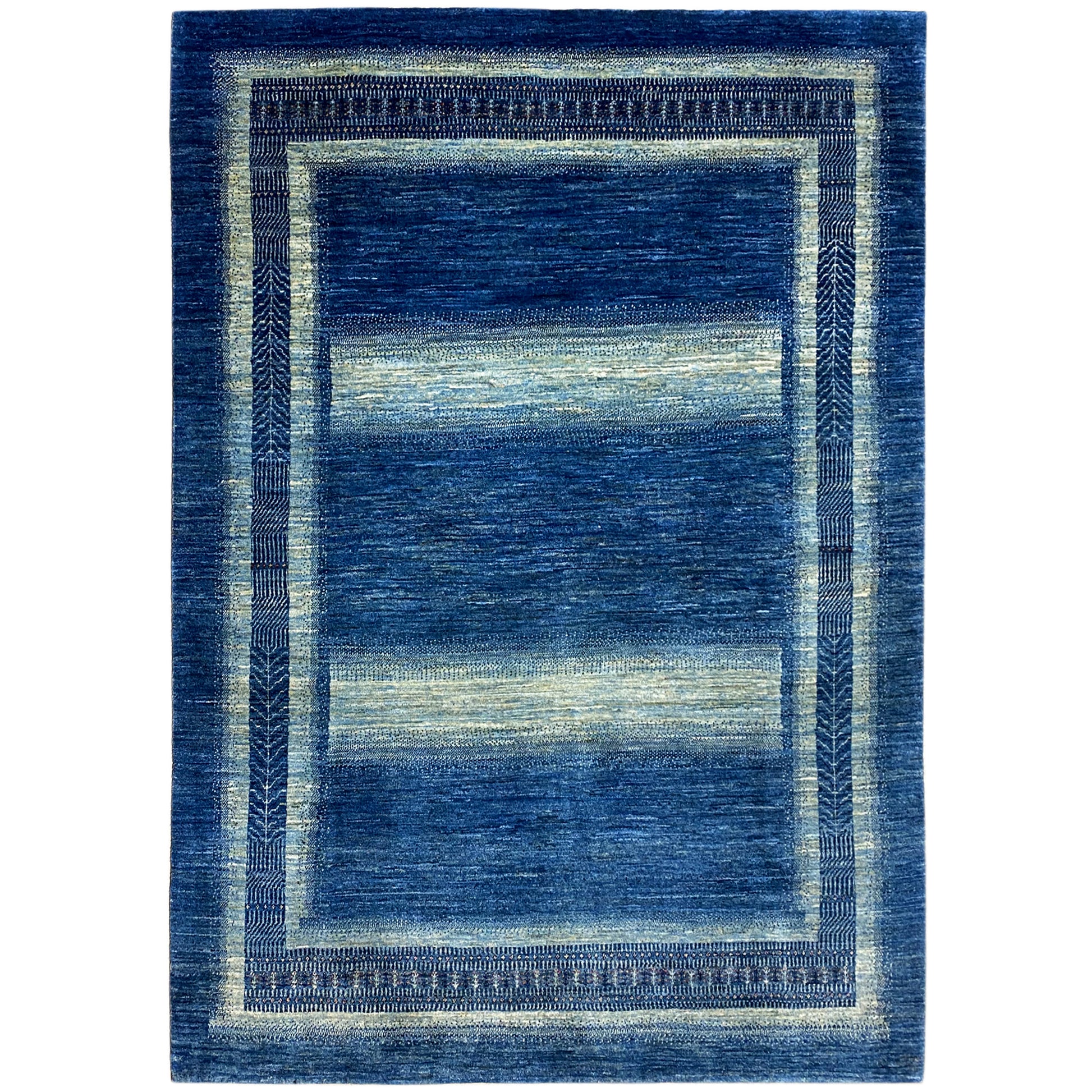 Este fascinante tapete Luri Gabbeh, feito à mão com lã fiada manualmente e tingida com plantas, apresenta-se em tons profundos de azul com um padrão retangular marcante e riscas discretas. Com um tamanho de 210x160cm, é um complemento ideal para uma variedade de estilos de decoração, desde o marítimo ao moderno, criando uma atmosfera tranquila e elegante. O artesanato autêntico e os materiais naturais fazem deste tapete uma obra de arte duradoura e única, que traz conforto e profundidade estética à sua casa.