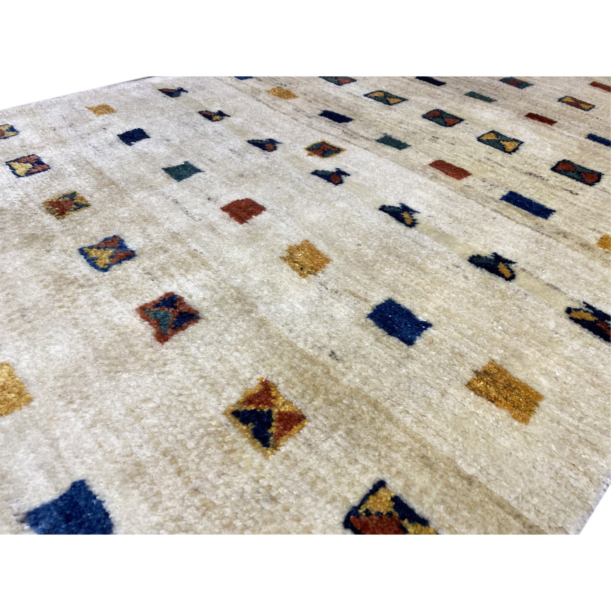 Este tapete Gabbeh único, feito à mão com nós, no tamanho 152x89cm, é confeccionado com lã fiada à mão e tingida com plantas. O seu design moderno destaca-se por um padrão lúdico de retângulos e quadrados coloridos sobre um fundo claro, cor de bege. Confere a qualquer espaço, seja em estilo moderno, contemporâneo ou eclético, um toque vibrante, trazendo ao mesmo tempo o calor natural e a textura de um autêntico tapete Gabbeh.
