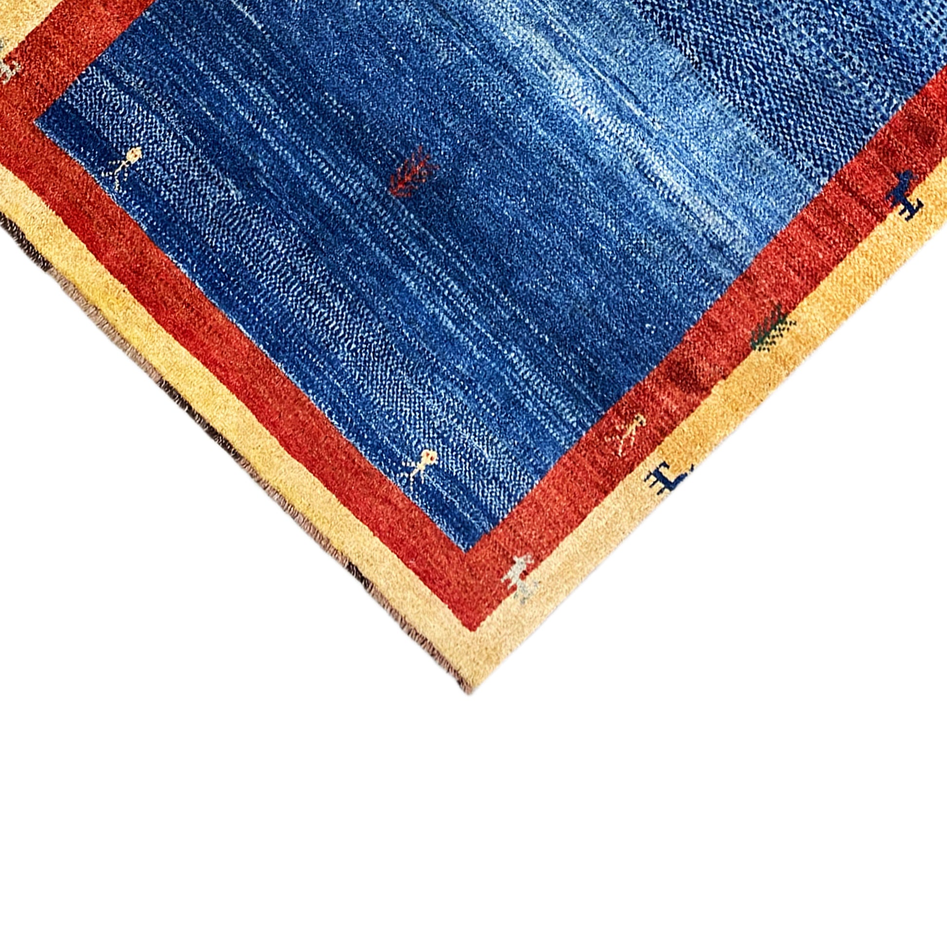 Este tapete Gabbeh expressivo, feito à mão com lã fiada à mão e tingida com plantas, apresenta um centro azul profundo, rodeado por uma borda interior vermelha marcante e uma borda exterior amarela larga com figuras estilizadas. Com as suas dimensões de 192x120 cm, é uma peça versátil que confere a qualquer espaço, do tradicional ao moderno, uma atmosfera vibrante e ao mesmo tempo ligada à terra. A combinação do artesanato tradicional, das cores vibrantes e do padrão figurativo único torna este tapete um destaque especial, que desperta interesse visual e proporciona conforto.