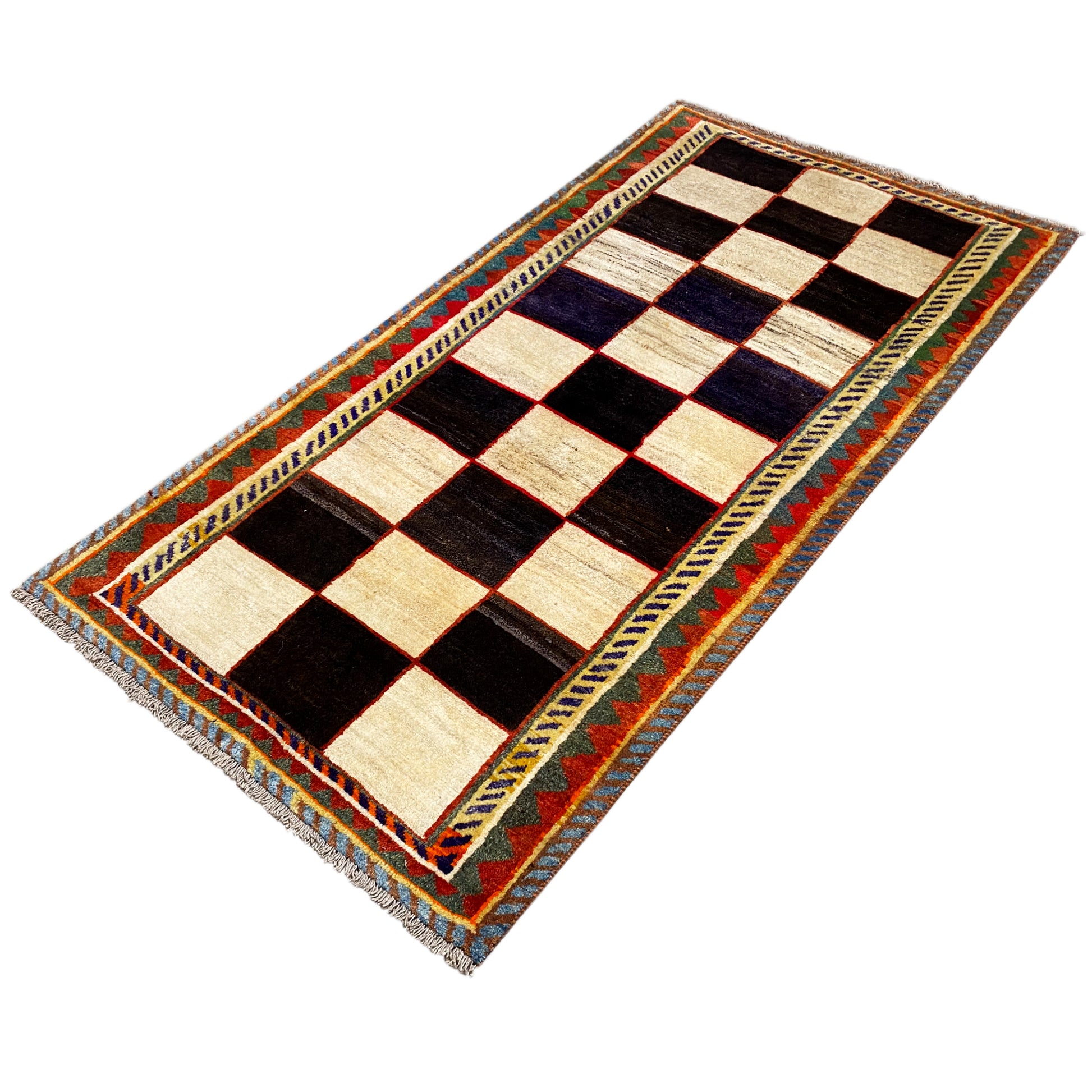 Este corredor Gabbeh expressivo, feito à mão com lã fiada à mão e tingida com plantas, fascina com um padrão clássico de tabuleiro de xadrez preto e branco, emoldurado por uma borda vibrante e multicolorida. Com as suas dimensões de 194x100 cm, é uma peça marcante que confere aos corredores, entradas ou espaços alongados uma estética dinâmica e ao mesmo tempo intemporal. A combinação de artesanato tradicional e o padrão gráfico torna este corredor um destaque especial, que irradia tanto modernidade como charme tradicional, criando uma atmosfera apelativa.