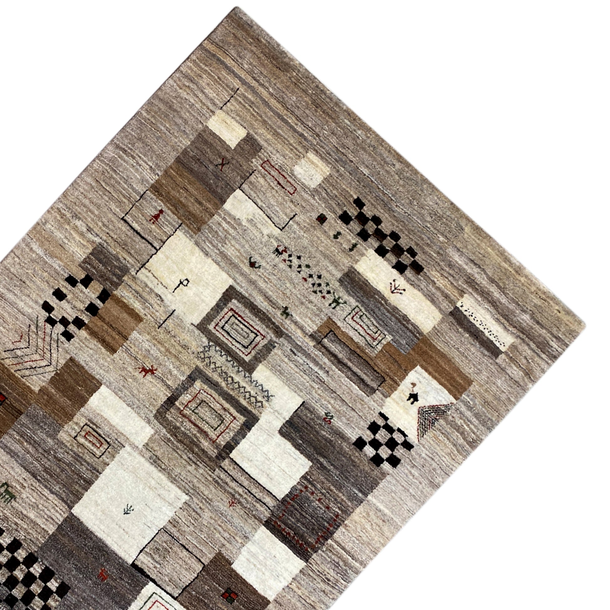 Este tapete Gabbeh feito à mão, em lã fiada manualmente e tingida com plantas, traz uma elegância natural a qualquer casa com o seu estilo decorativo moderno e padrão geométrico. Com um tamanho de 242x169cm, este tapete único não é apenas um ponto focal, mas também uma adição duradoura e sustentável ao seu interior, perfeito para a sala de estar ou quarto.