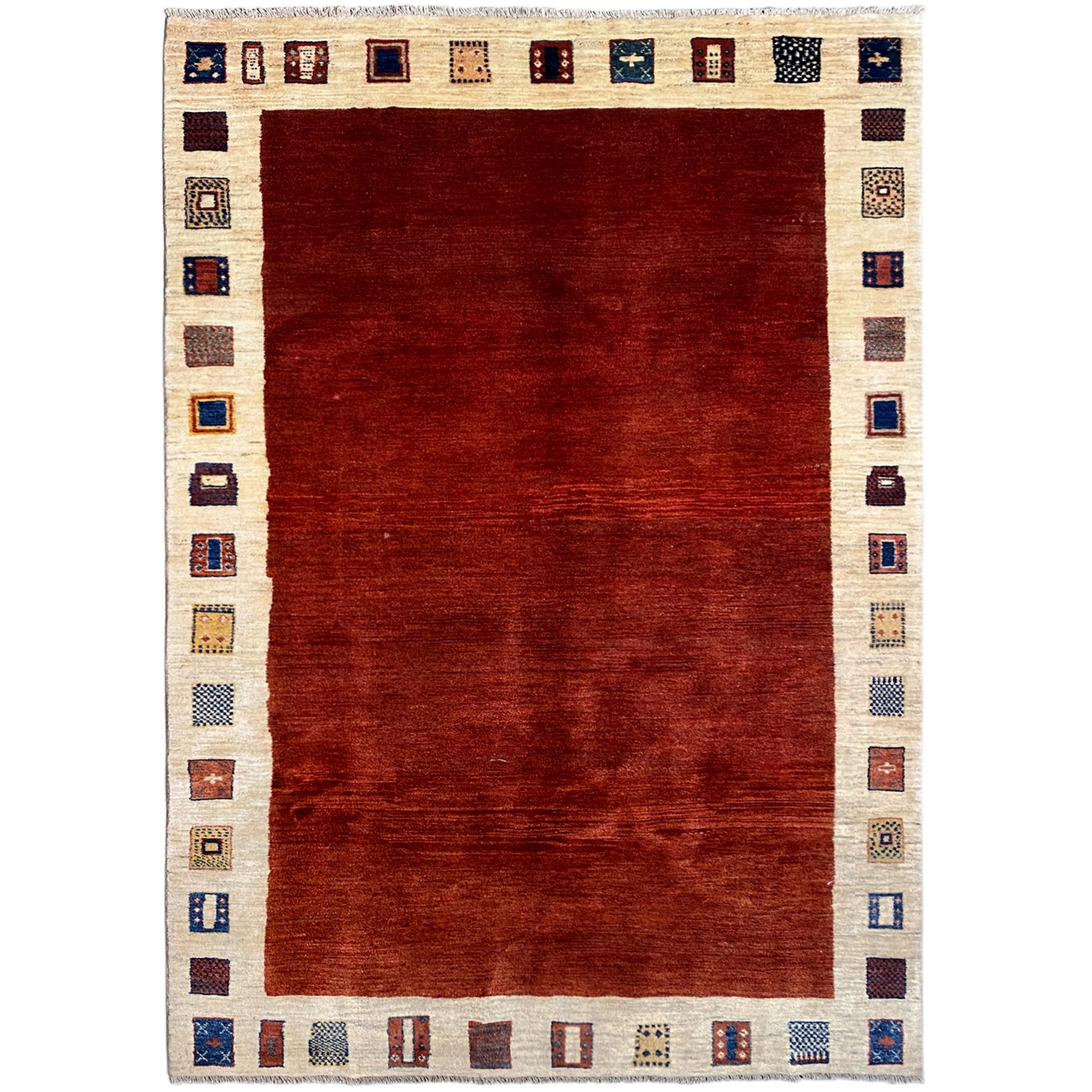 Este impressionante tapete Gabbeh, feito à mão com lã fiada manualmente e tingida com plantas, destaca-se pelo seu núcleo vermelho quente, rodeado por uma ampla borda bege com motivos geométricos coloridos. Com as suas generosas dimensões de 287x197 cm, é um ponto focal central que confere a qualquer espaço de estar uma atmosfera acolhedora e ao mesmo tempo artística. A harmoniosa combinação da cor principal intensa com os detalhes lúdicos da borda torna este tapete um elemento versátil, adequado tanto para estilos de decoração tradicionais como modernos, contando simultaneamente uma história de artesanato.