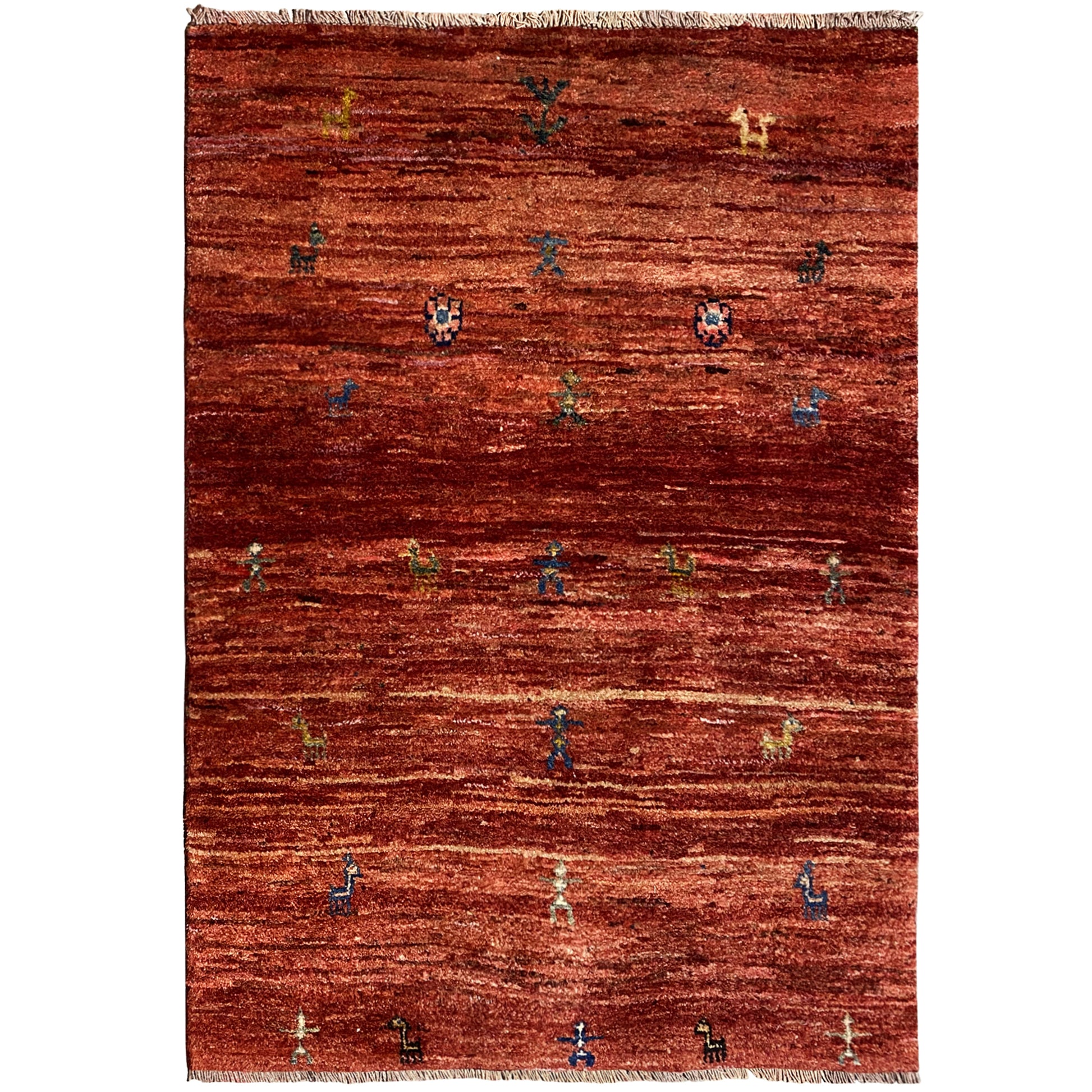 Este tapete Gabbeh expressivo, feito à mão com nós, no tamanho 140x93cm, é confeccionado com lã fiada à mão e tingida com plantas. O seu campo vermelho profundo é animado por uma variedade de pequenos motivos lúdicos de animais e figuras em acentos coloridos, que contam uma história tradicional. Este tapete único confere a qualquer espaço, seja em estilo rústico, tribal ou eclético, uma atmosfera quente e autêntica, sendo uma verdadeira obra de arte para o chão.