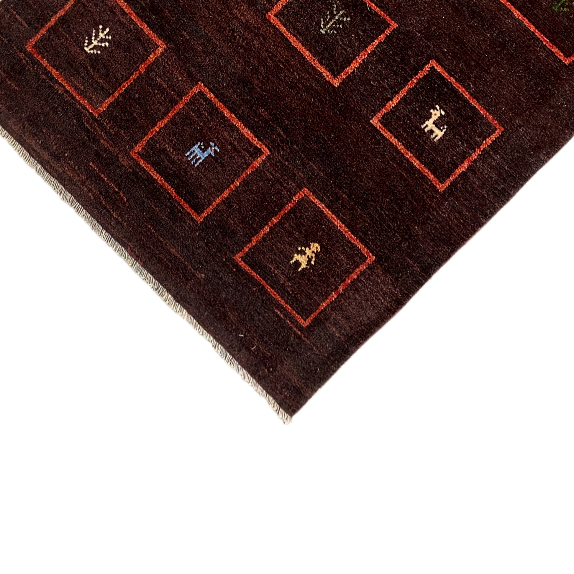 Este tapete Gabbeh expressivo, feito à mão com nós, no tamanho 147x99cm, é confeccionado com lã fiada à mão e tingida com plantas, destacando-se por um castanho profundo como cor principal. O seu padrão tradicional de grelha apresenta em cada quadrado vermelho motivos únicos, estilizados de animais e figuras, que contam uma história. Este tapete traz um calor autêntico e um charme rústico e tribal a qualquer casa, sendo uma peça única e duradoura.