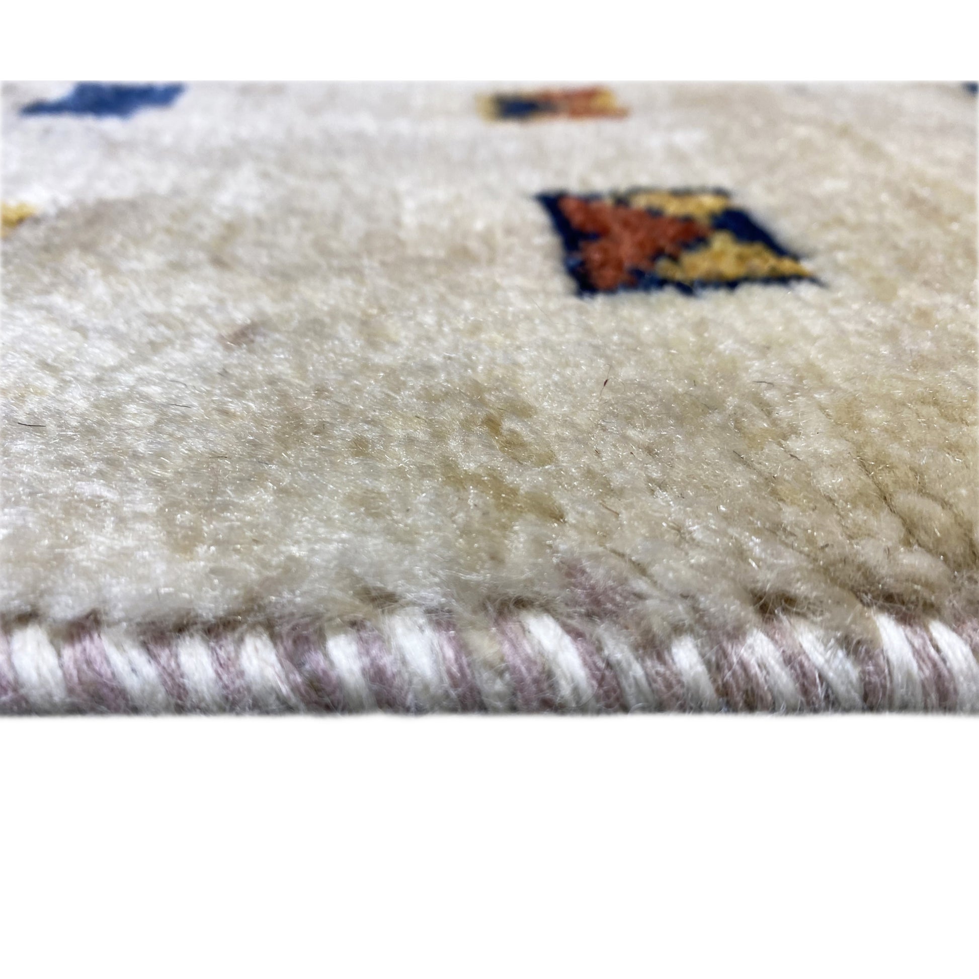 Este tapete Gabbeh único, feito à mão com nós, no tamanho 152x89cm, é confeccionado com lã fiada à mão e tingida com plantas. O seu design moderno destaca-se por um padrão lúdico de retângulos e quadrados coloridos sobre um fundo claro, cor de bege. Confere a qualquer espaço, seja em estilo moderno, contemporâneo ou eclético, um toque vibrante, trazendo ao mesmo tempo o calor natural e a textura de um autêntico tapete Gabbeh.