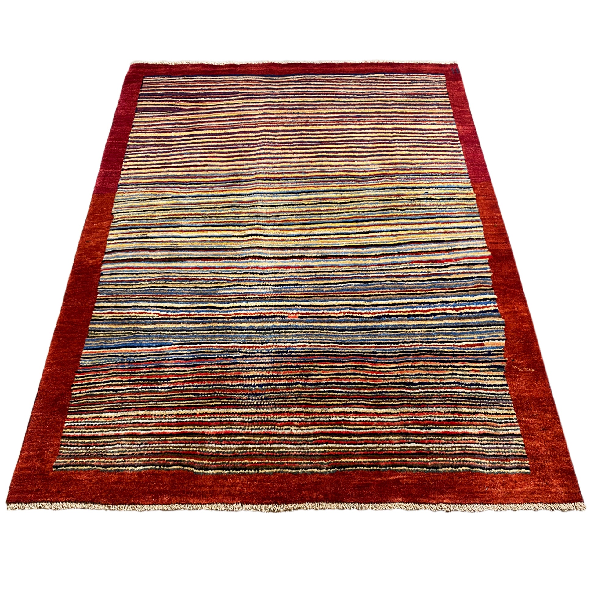 Este tapete Gabbeh único, feito à mão com lã fiada manualmente e tingida com plantas, fascina com um padrão vibrante de riscas multicoloridas, emoldurado por uma borda quente vermelha. Com as suas dimensões de 186x134 cm, é uma peça versátil que confere a qualquer espaço, do moderno ao boho, um toque lúdico e ao mesmo tempo terroso. A combinação de artesanato tradicional e design dinâmico torna este tapete num destaque especial, que desperta interesse visual e proporciona conforto.