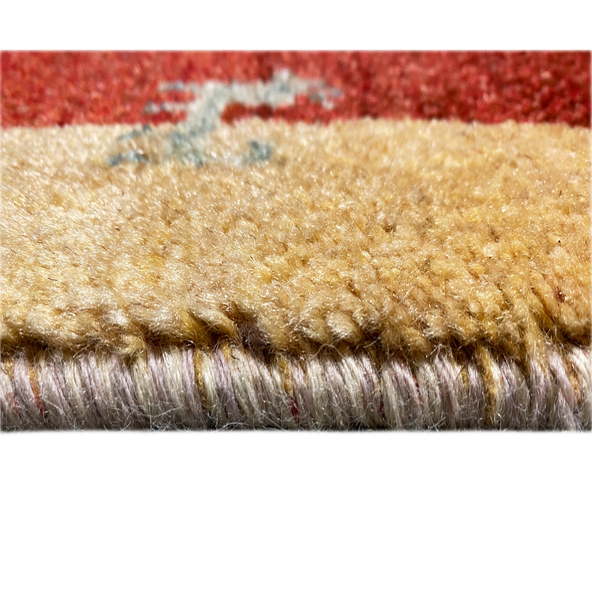 Este tapete Gabbeh expressivo, feito à mão com lã fiada à mão e tingida com plantas, apresenta um centro azul profundo, rodeado por uma borda interior vermelha marcante e uma borda exterior amarela larga com figuras estilizadas. Com as suas dimensões de 192x120 cm, é uma peça versátil que confere a qualquer espaço, do tradicional ao moderno, uma atmosfera vibrante e ao mesmo tempo ligada à terra. A combinação do artesanato tradicional, das cores vibrantes e do padrão figurativo único torna este tapete um destaque especial, que desperta interesse visual e proporciona conforto.