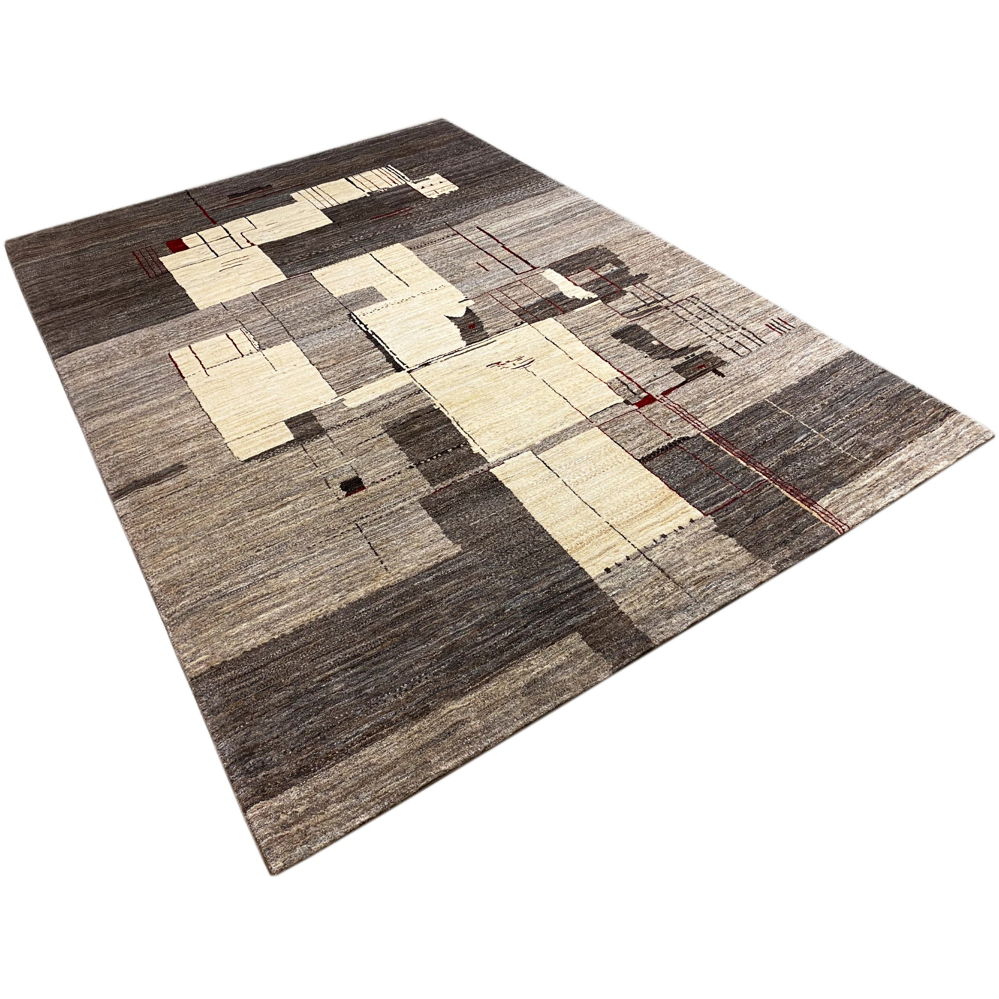 Este tapete Gabbeh feito à mão, em lã fiada à mão e tingida com plantas, destaca-se pelo seu estilo decorativo moderno e padrão abstrato. Com um tamanho de 302x209cm, este tapete único em tons de cinza oferece um complemento elegante e duradouro que confere um toque contemporâneo ao seu espaço de estar.