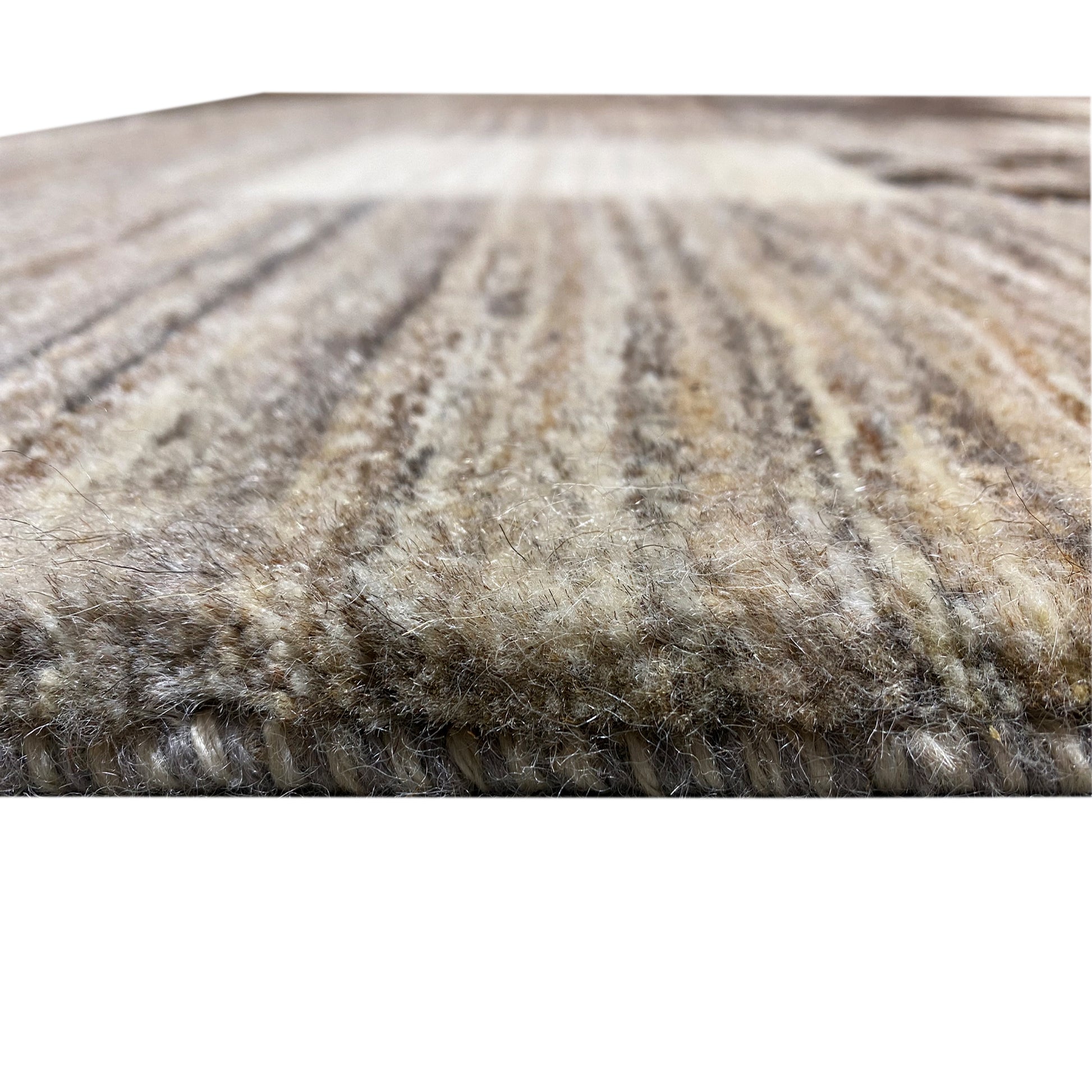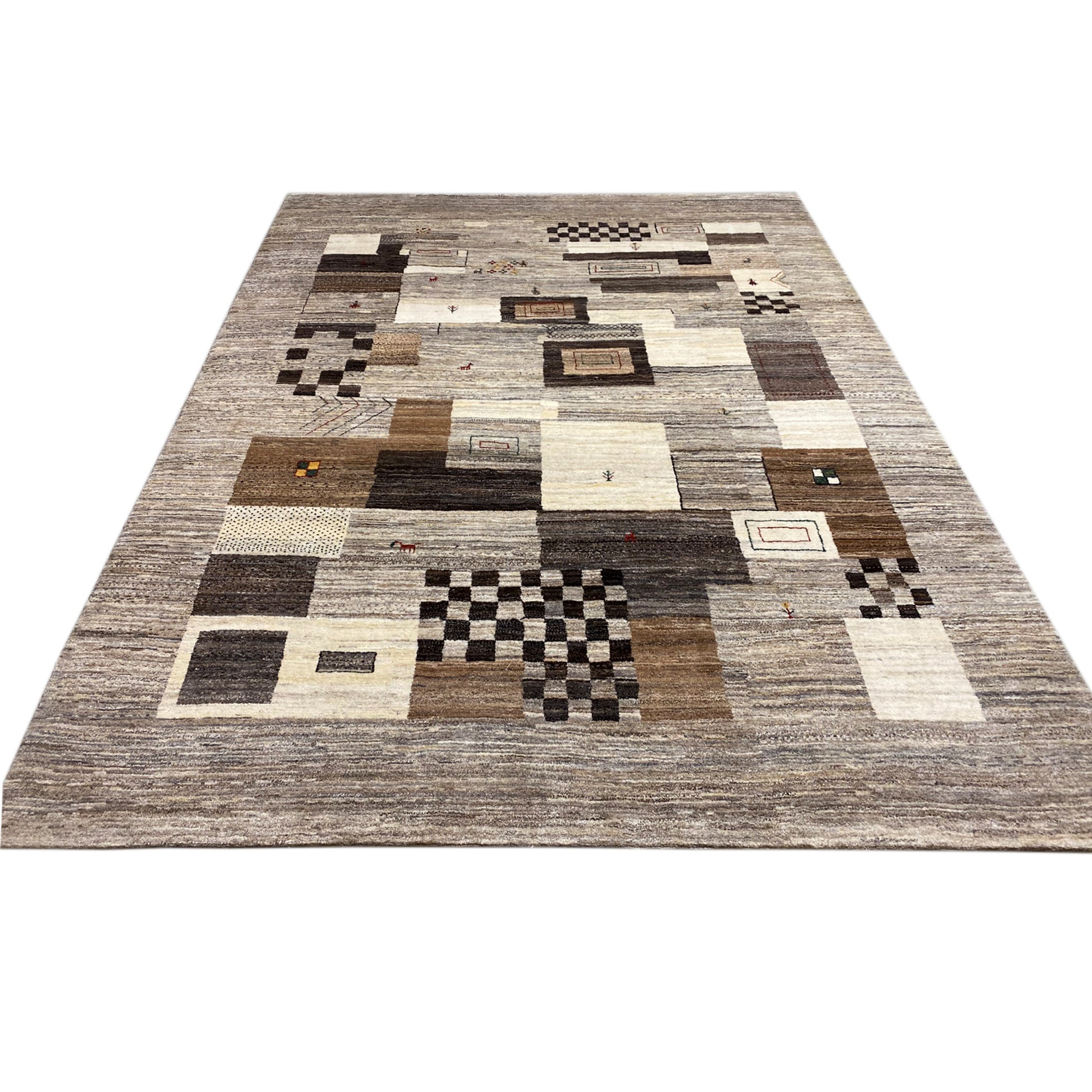 Este impressionante tapete Gabbeh feito à mão, em lã fiada à mão e tingida com plantas, traz a beleza natural para a sua casa com o seu estilo de decoração moderno e o seu fascinante padrão geométrico. Com dimensões generosas de 304x246cm, este tapete único em tons bege é perfeito para conferir a qualquer divisão uma atmosfera quente e elegante.