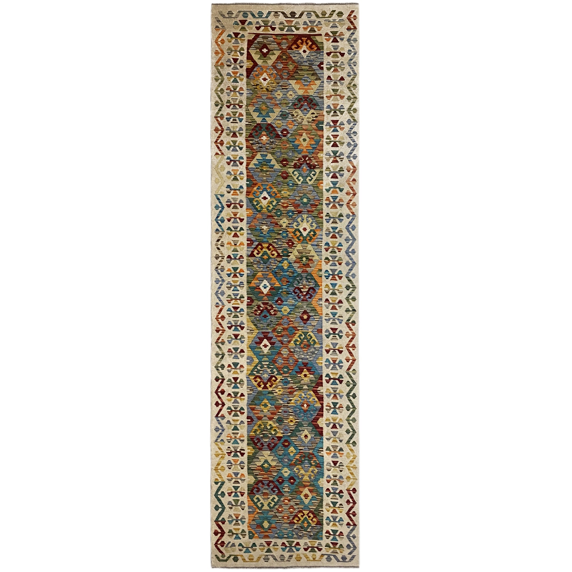 Este corredor Kelim afegão único, tecido à mão, com o tamanho de 386x87cm, é feito de lã fiada à mão. O campo central multicolorido destaca-se por um padrão complexo e geométrico de losangos e ziguezagues, enquadrado por bordas largas bege com motivos tribais menores. Perfeito para corredores longos e passagens, este corredor confere a qualquer espaço um charme étnico vibrante e a robusta beleza do artesanato tradicional afegão.