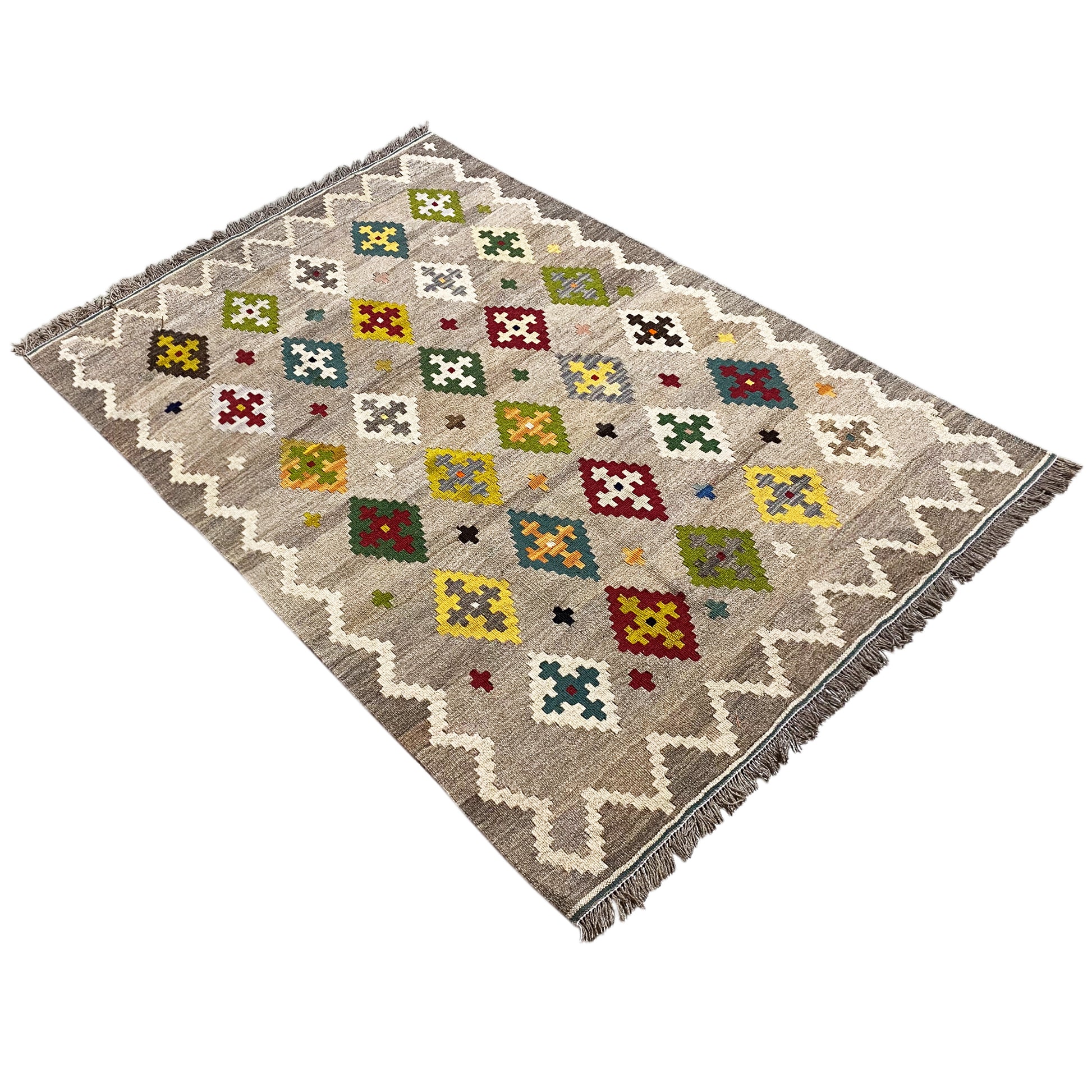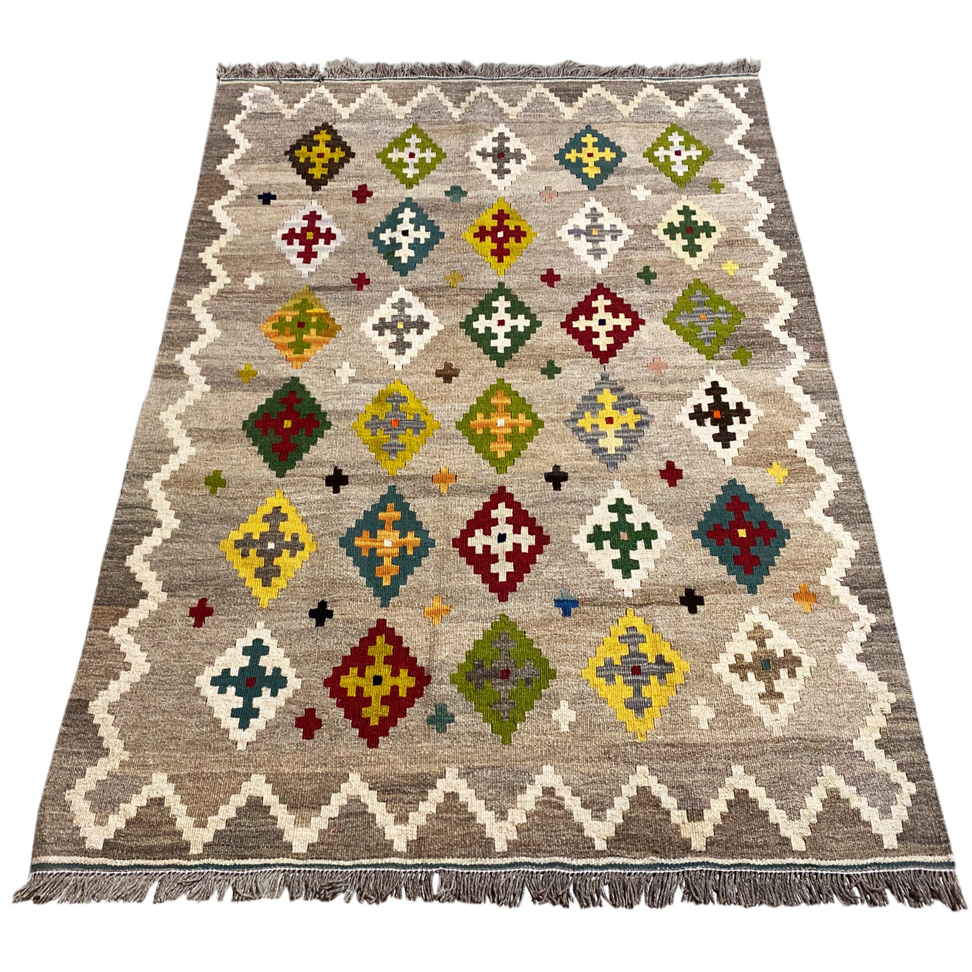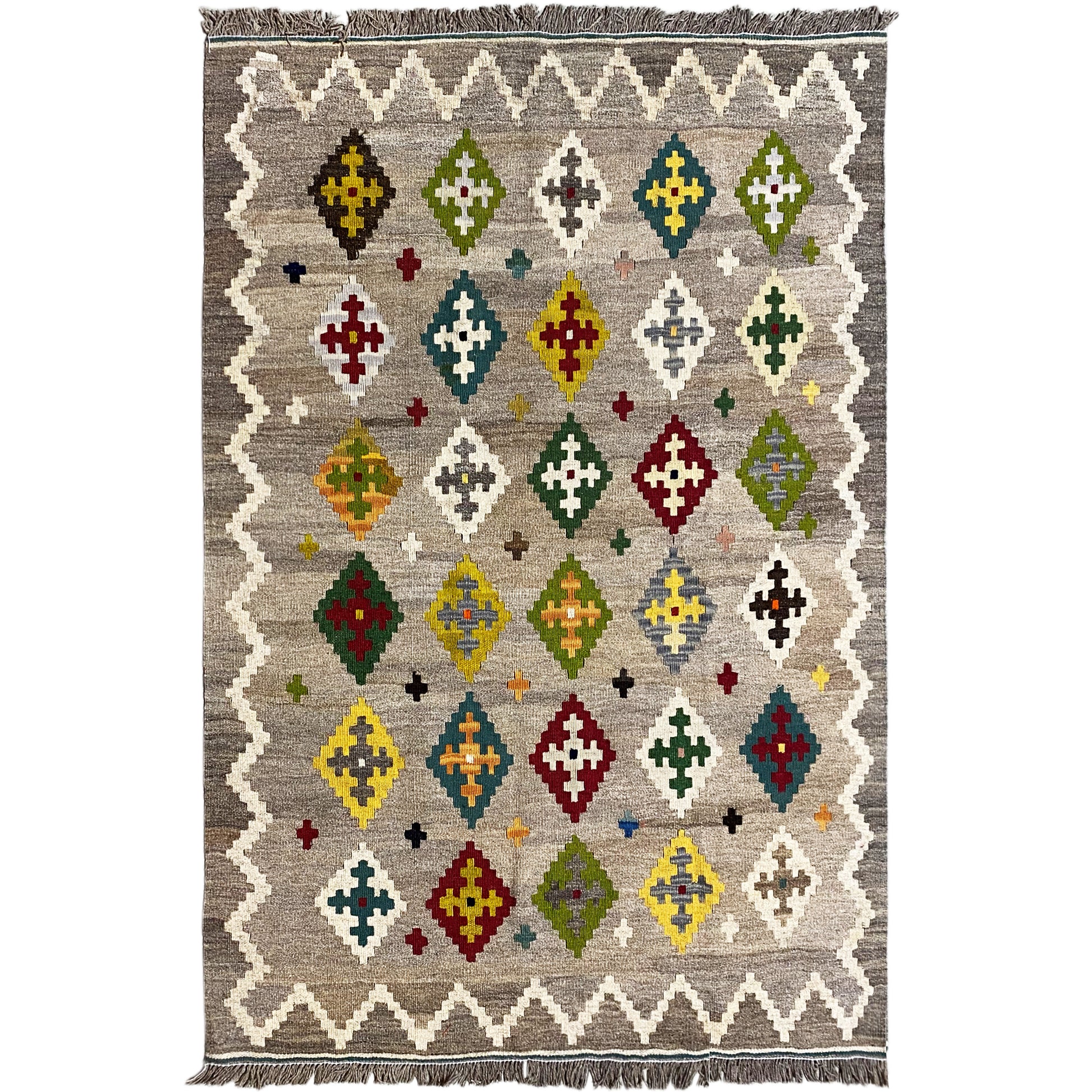 Este tapete Kelim Qashqai único, tecido à mão com lã fiada manualmente, confere a qualquer espaço uma atmosfera autêntica, rústica ou boémia. Com os seus vivos padrões geométricos em forma de losango e dimensões de 146x100 cm, este tapete resistente de tecido plano é perfeito para adicionar um toque de calor e carácter à sua sala de estar, quarto ou corredor. Feito de lã de alta qualidade, oferece durabilidade e uma textura agradável, enquanto o seu design intemporal proporciona uma decoração inspiradora.