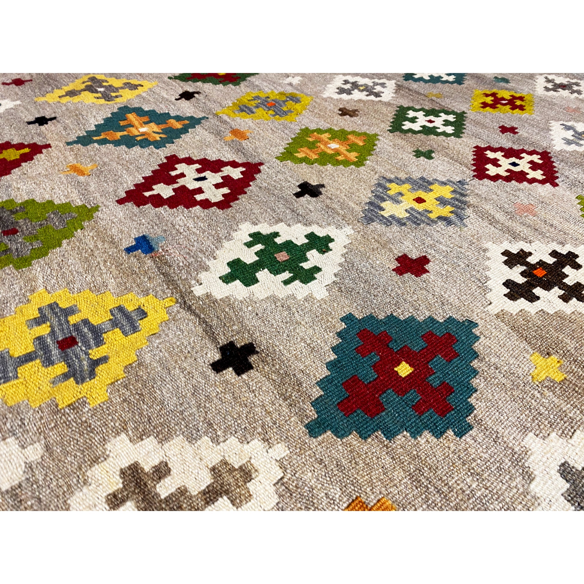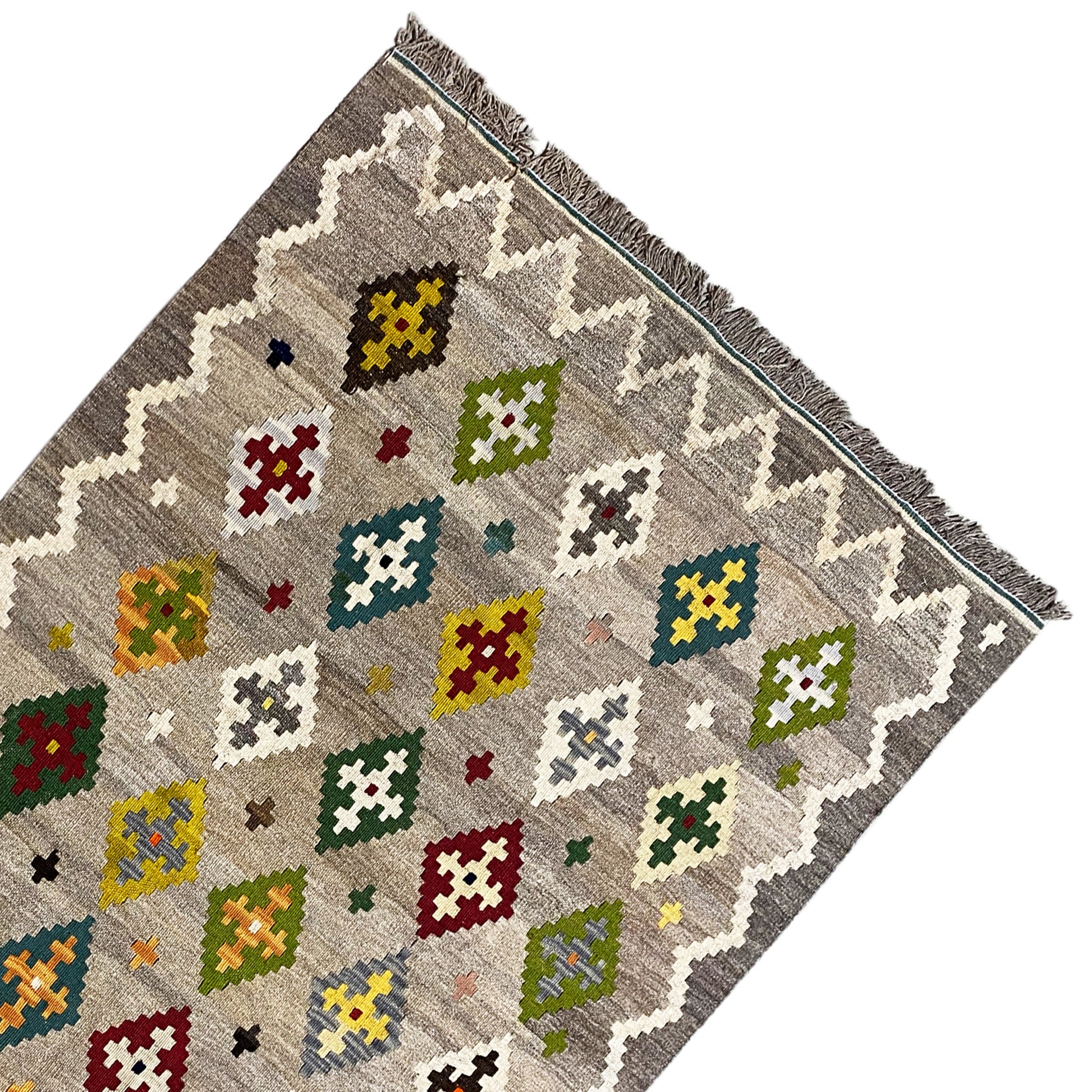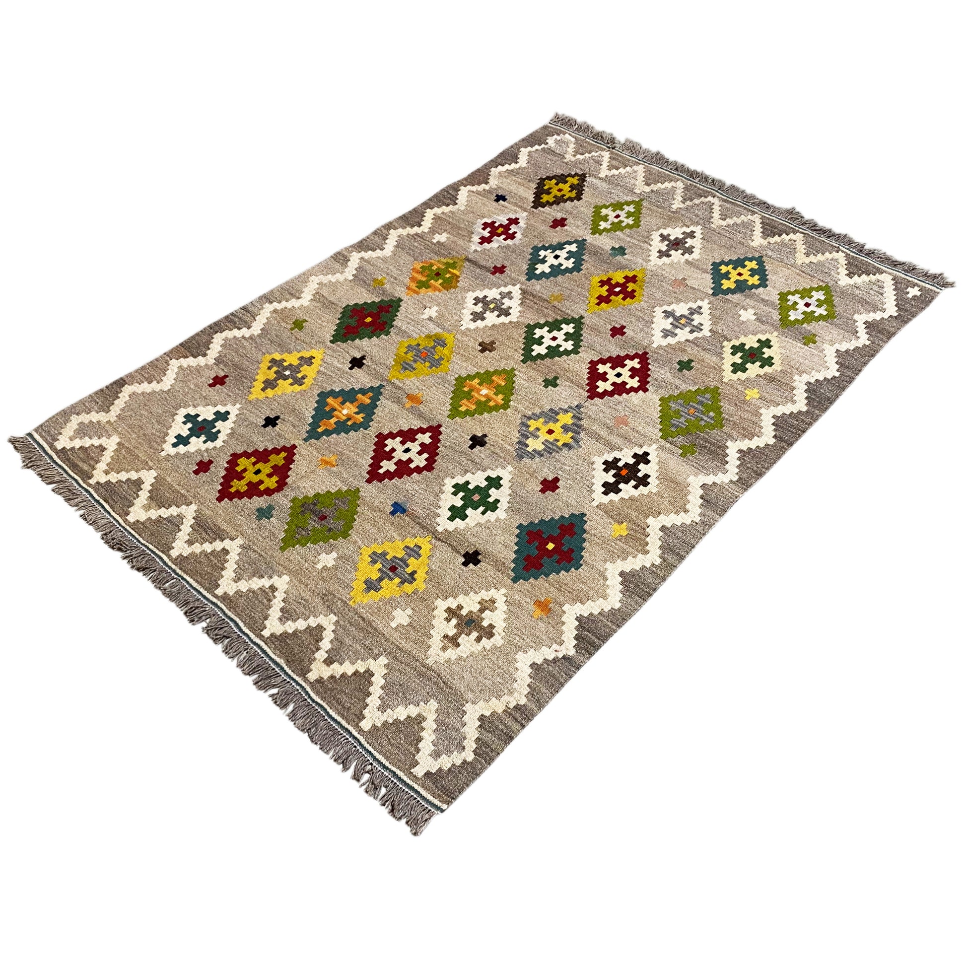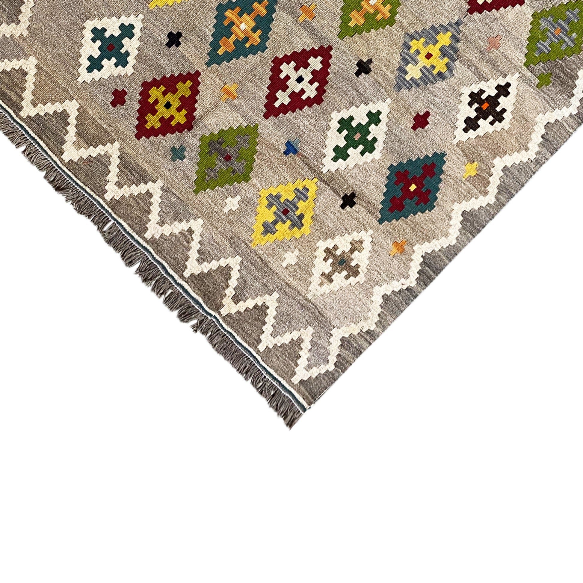 Este tapete Kelim Qashqai único, tecido à mão com lã fiada manualmente, confere a qualquer espaço uma atmosfera autêntica, rústica ou boémia. Com os seus vivos padrões geométricos em forma de losango e dimensões de 146x100 cm, este tapete resistente de tecido plano é perfeito para adicionar um toque de calor e carácter à sua sala de estar, quarto ou corredor. Feito de lã de alta qualidade, oferece durabilidade e uma textura agradável, enquanto o seu design intemporal proporciona uma decoração inspiradora.