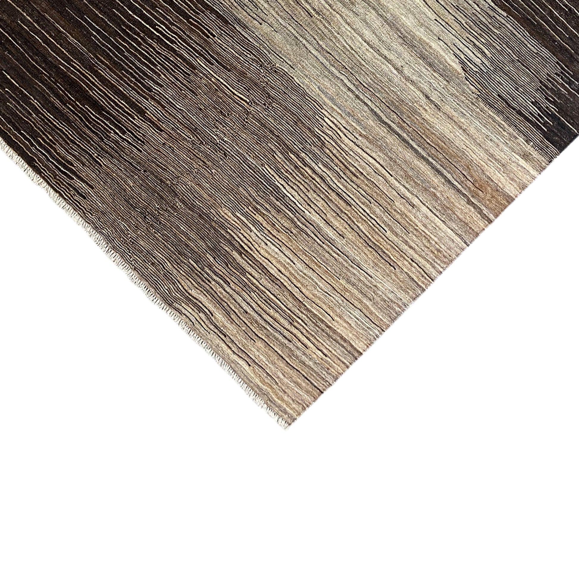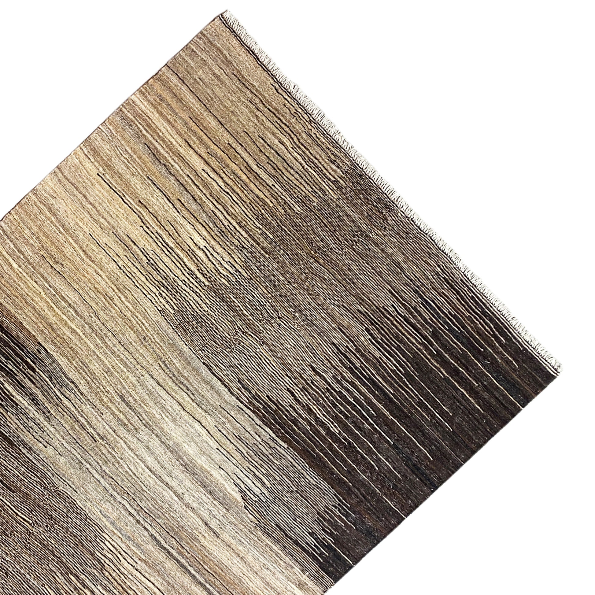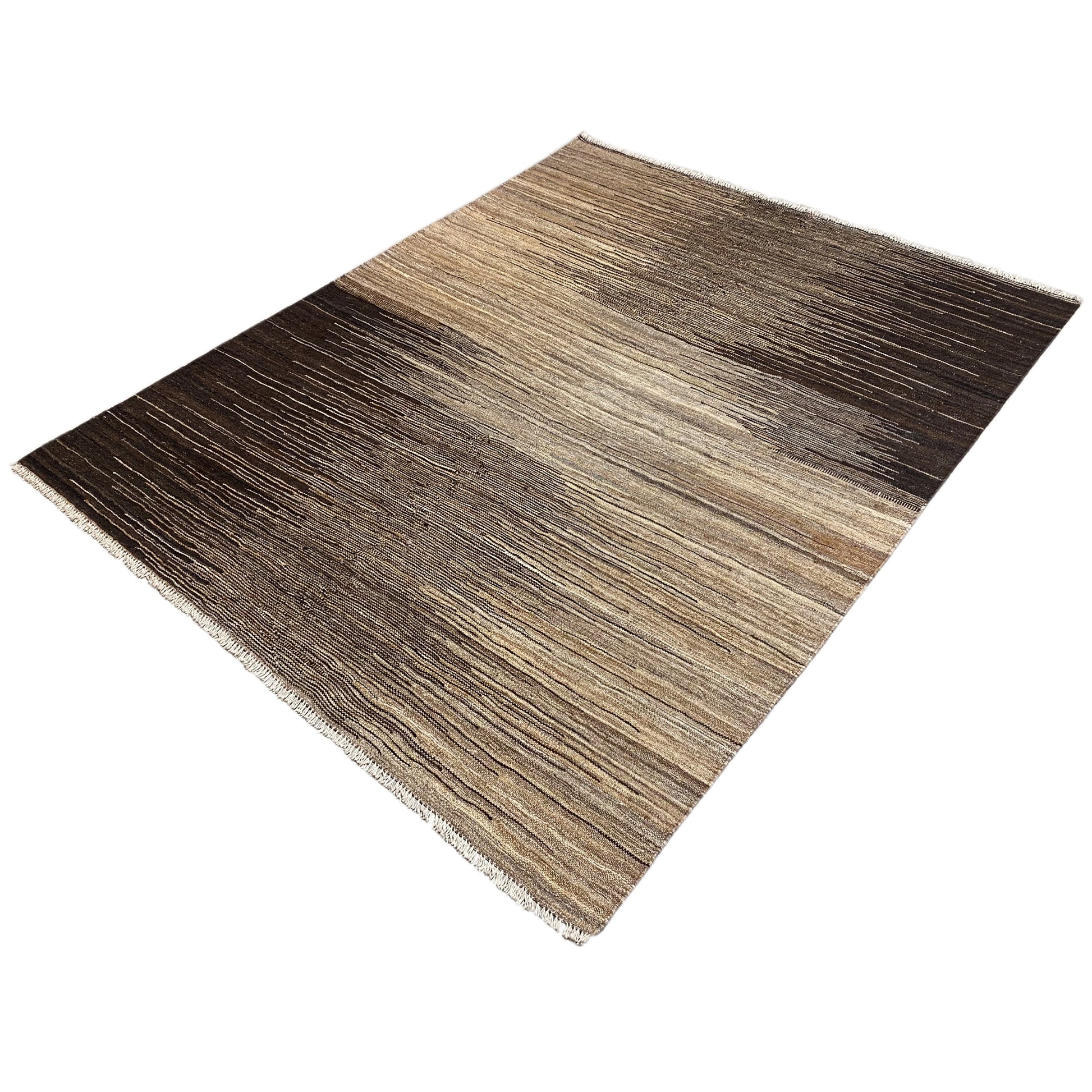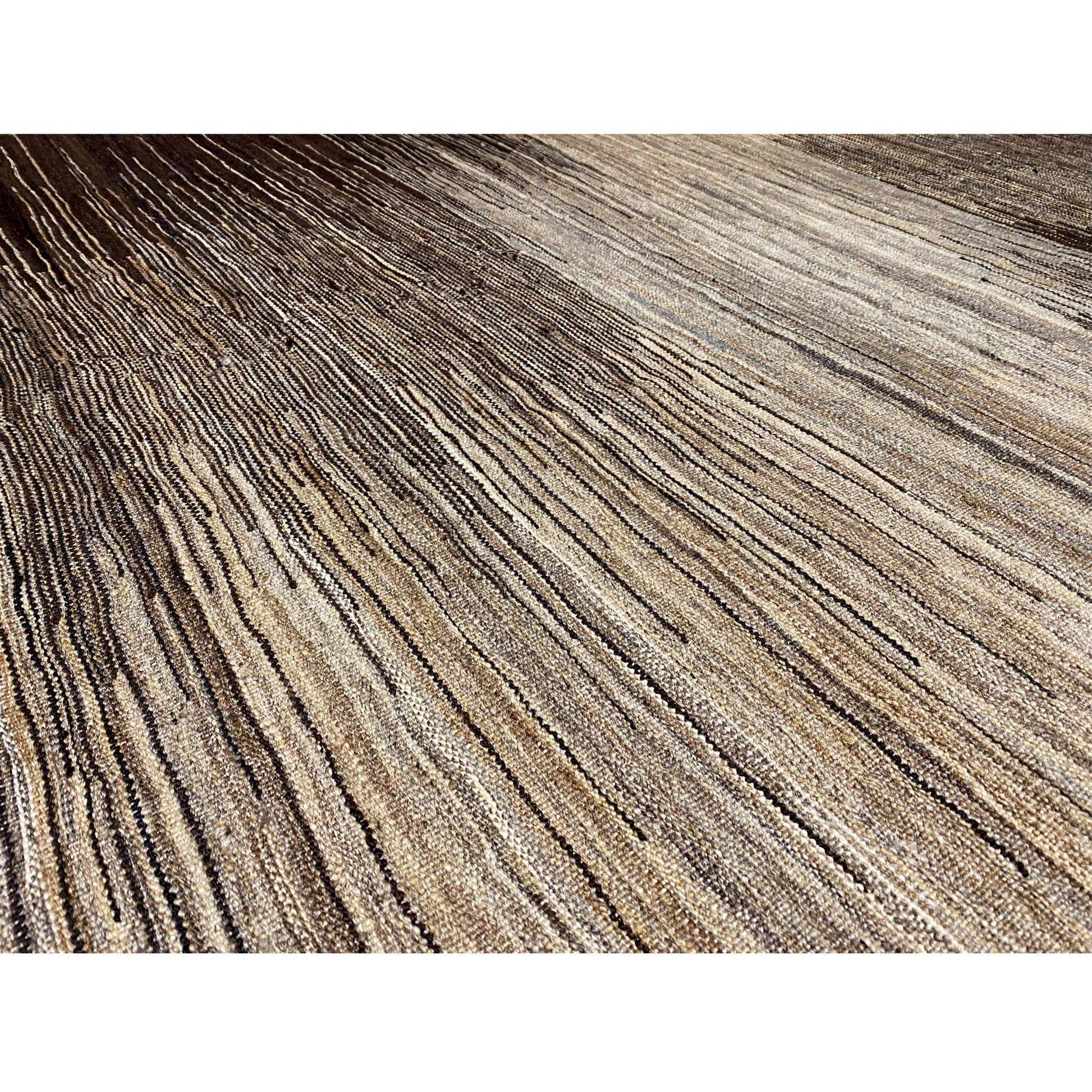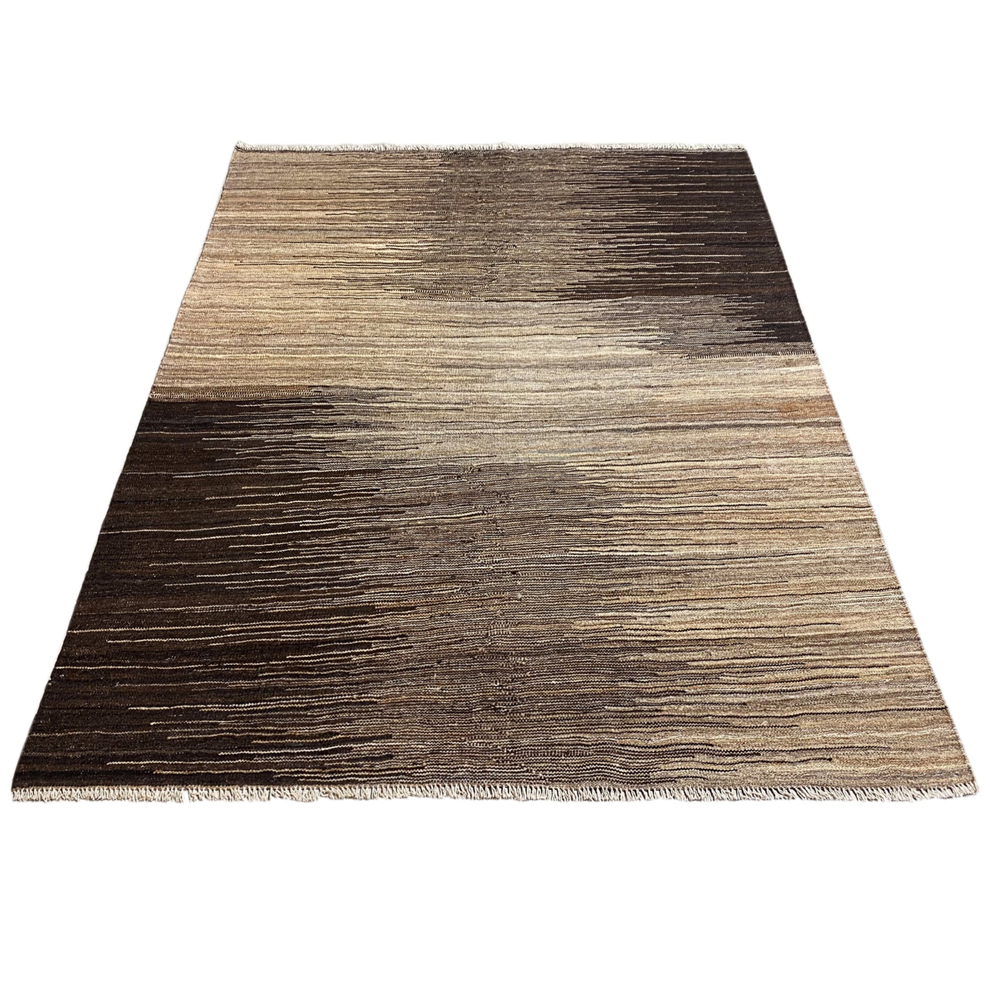 Este impressionante Kelim Qashqai tecido à mão com lã fiada manualmente destaca-se pelo seu padrão abstrato único de riscas em tons naturais de castanho e bege. Com um tamanho de 192x150 cm, este tapete versátil é uma adição ideal para vários estilos de decoração, como Moderno, Boho ou Rústico. Oferece não só uma superfície macia e confortável para os pés, mas também a durabilidade e a autenticidade de um verdadeiro artesanato, perfeito para conferir a qualquer espaço um toque natural e elegante.