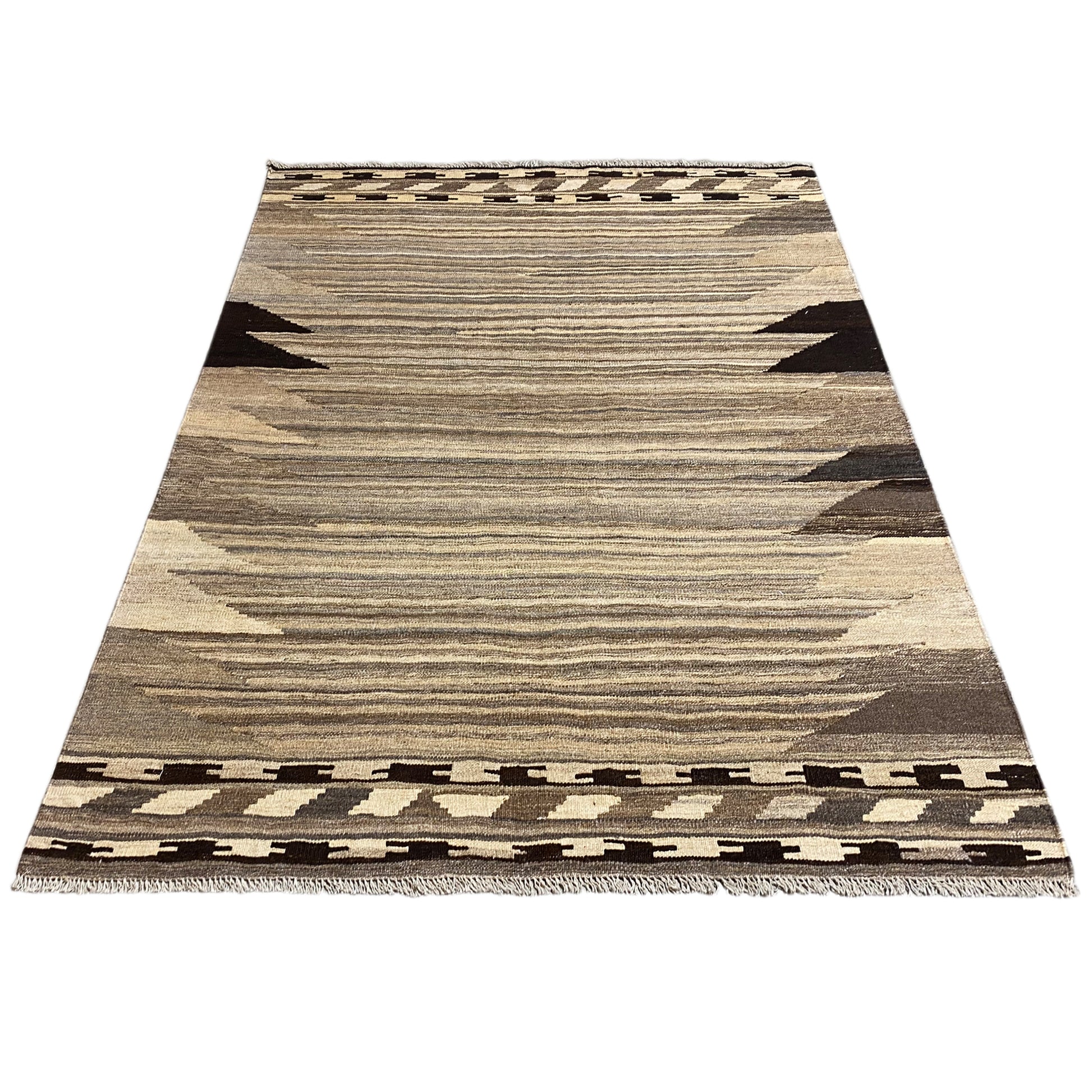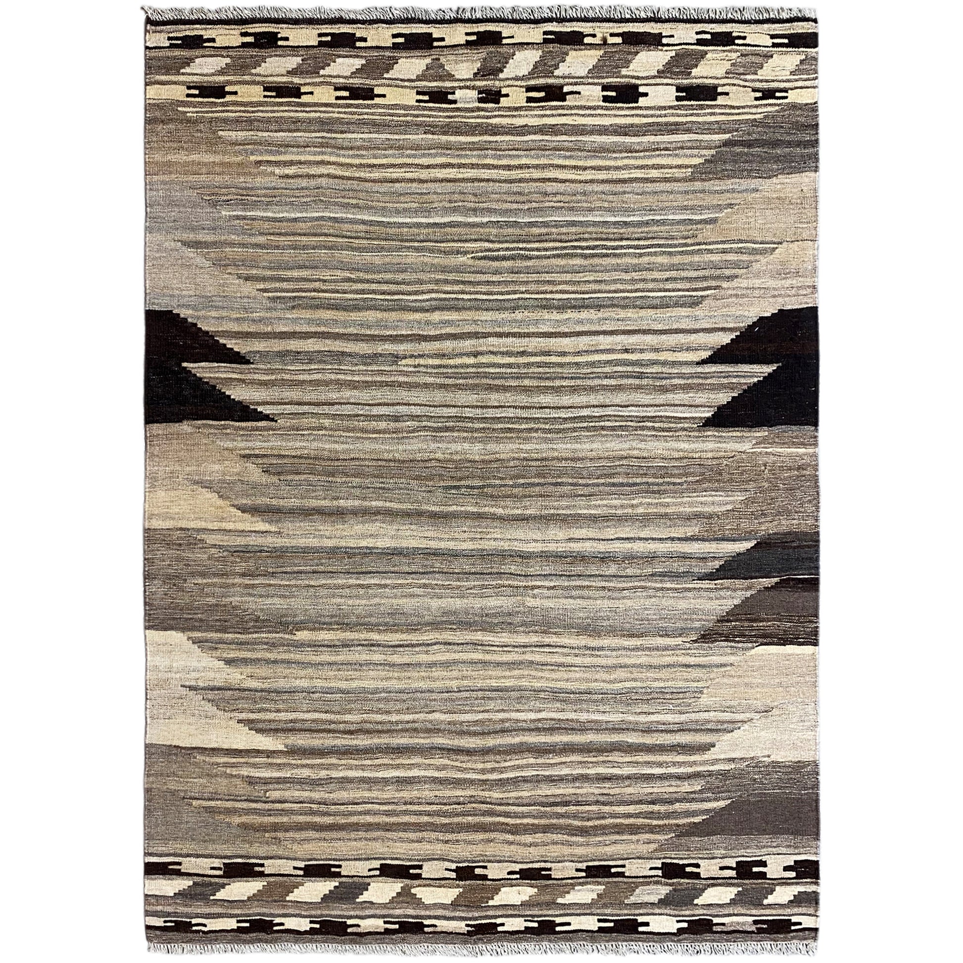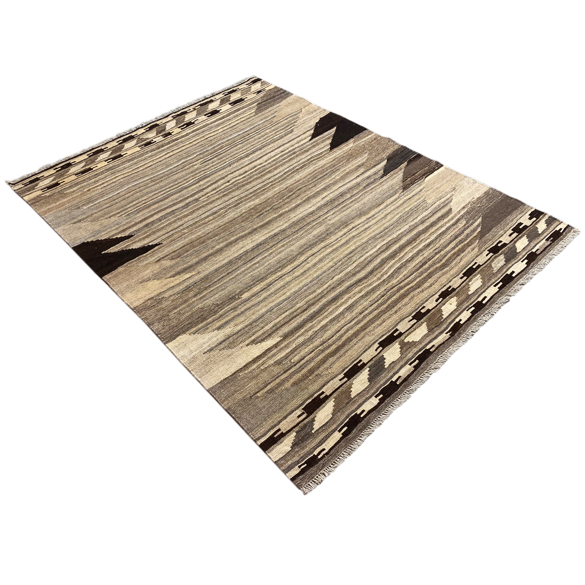 Este tapete Kelim Qashqai, tecido à mão com lã fiada manualmente, apresenta um design abstrato único com formas geométricas marcantes e riscas em tons naturais de cinza e bege. Com um tamanho de 197x148 cm, este tapete resistente de tecido plano é ideal para complementar estilos de decoração modernos, minimalistas ou escandinavos. Combina artesanato tradicional com estética contemporânea, criando uma atmosfera tranquila mas expressiva que valoriza qualquer espaço, oferecendo ao mesmo tempo durabilidade.