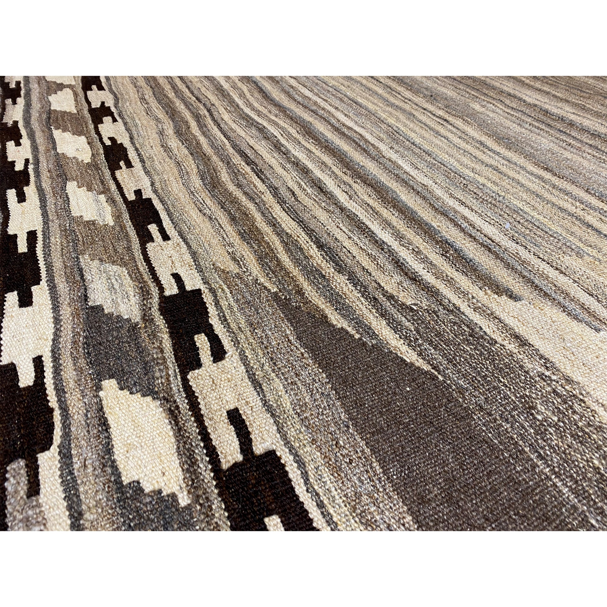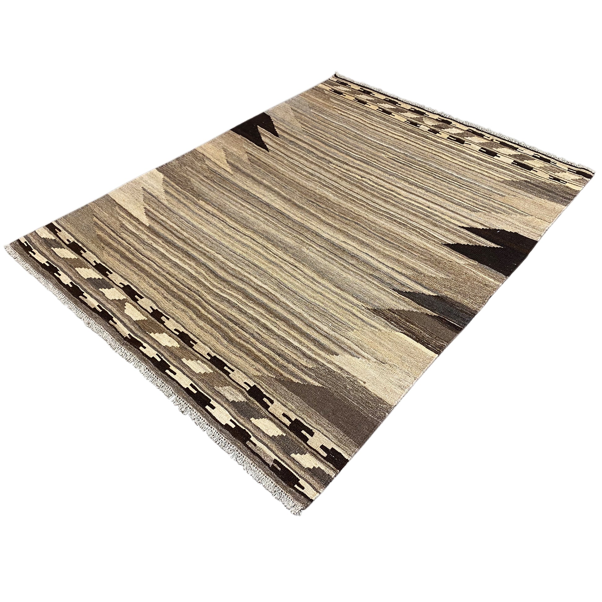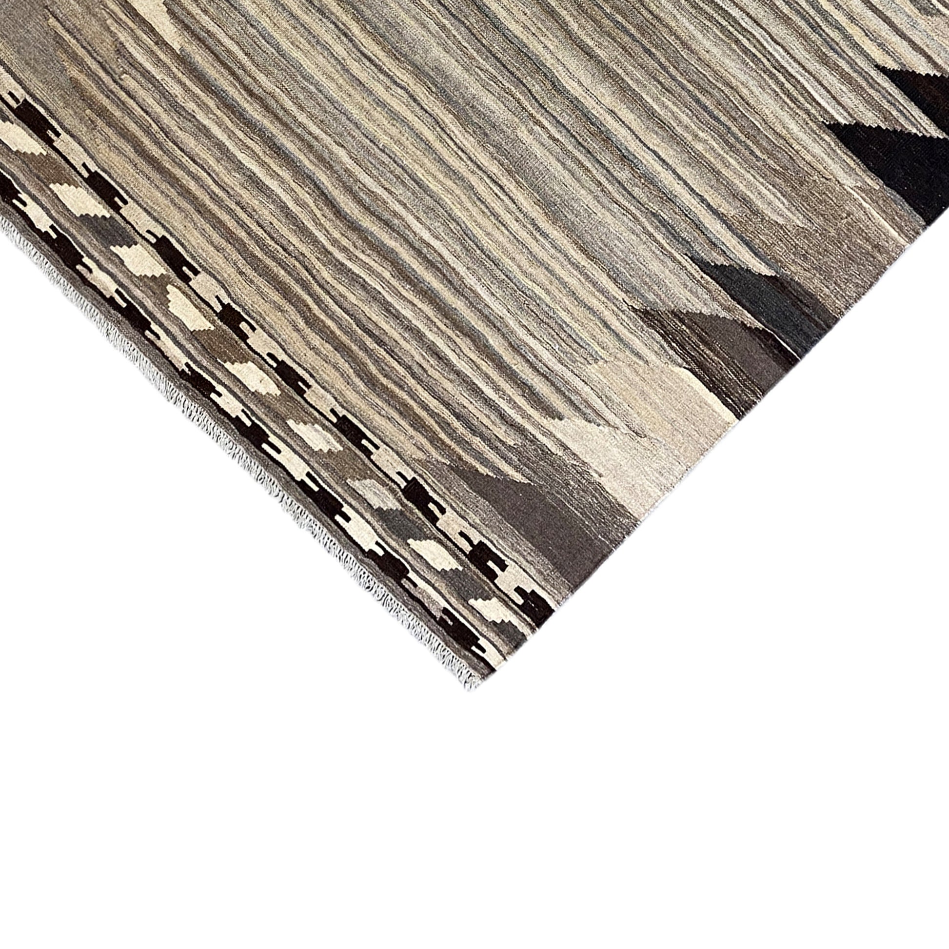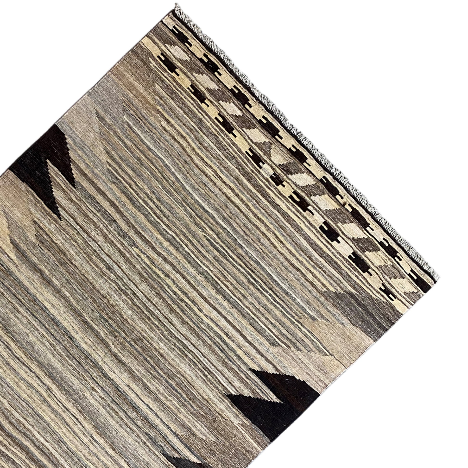 Este tapete Kelim Qashqai, tecido à mão com lã fiada manualmente, apresenta um design abstrato único com formas geométricas marcantes e riscas em tons naturais de cinza e bege. Com um tamanho de 197x148 cm, este tapete resistente de tecido plano é ideal para complementar estilos de decoração modernos, minimalistas ou escandinavos. Combina artesanato tradicional com estética contemporânea, criando uma atmosfera tranquila mas expressiva que valoriza qualquer espaço, oferecendo ao mesmo tempo durabilidade.