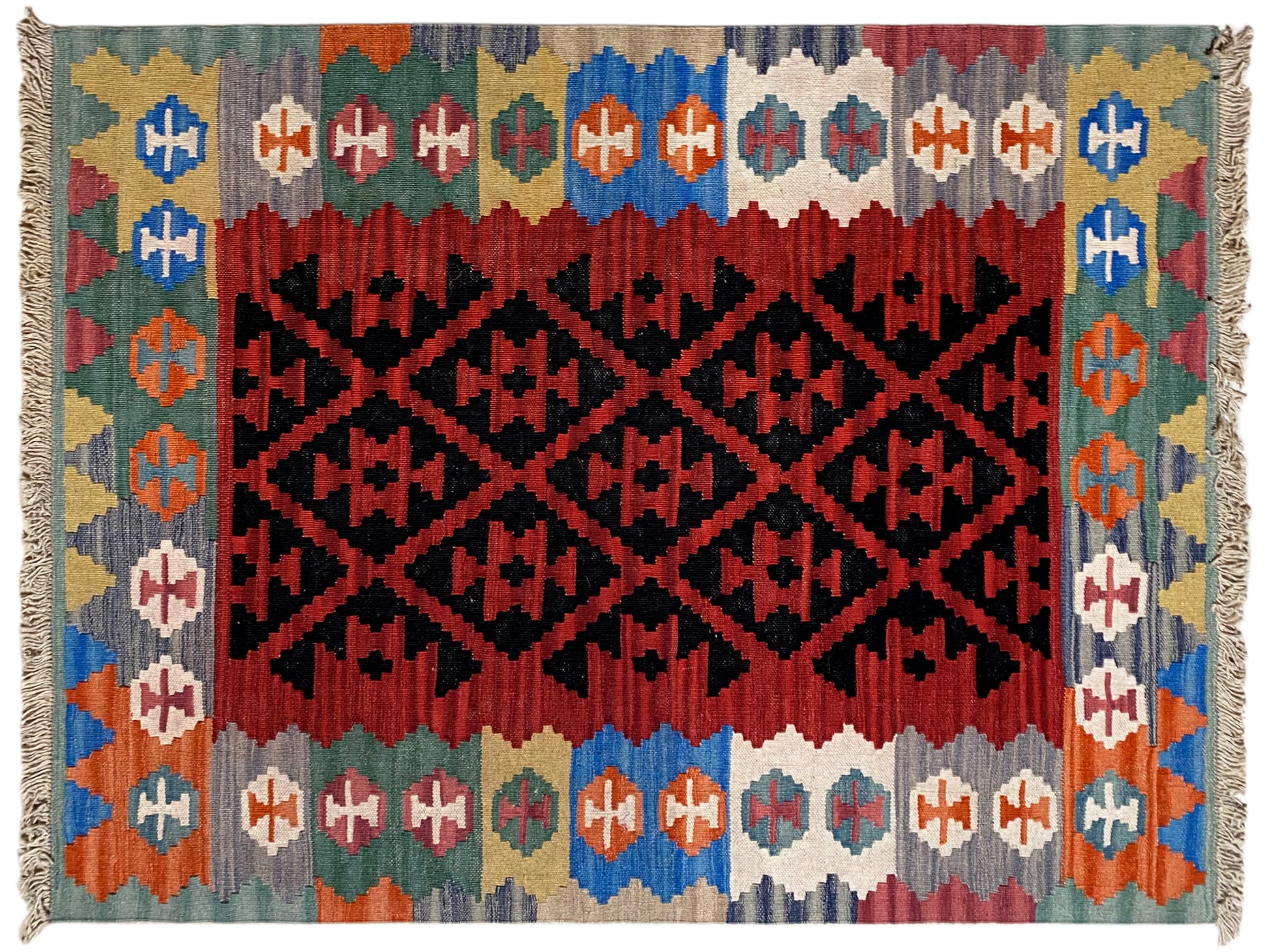 Dieser handgewebte Kelim Qashqai Teppich in kräftigem Rot (145x106 cm) bringt lebendigen Boho- & Ethno-Decor-Stil in Ihr Zuhause. Hergestellt aus handversponnener Wolle (100% ungefärbte Naturfaser) ist er strapazierfähig, nachhaltig und angenehm griffig. Das ausdrucksstarke geometrische Rauten- und Tribal-Muster mit kontrastreichen Details in Schwarz sowie bunten Bordüren in Blau, Grün, Ocker und Weiß macht ihn zu einem echten Statement-Piece – ideal für Wohnzimmer, Flur oder als Akzentteppich im Schlafzimmer.