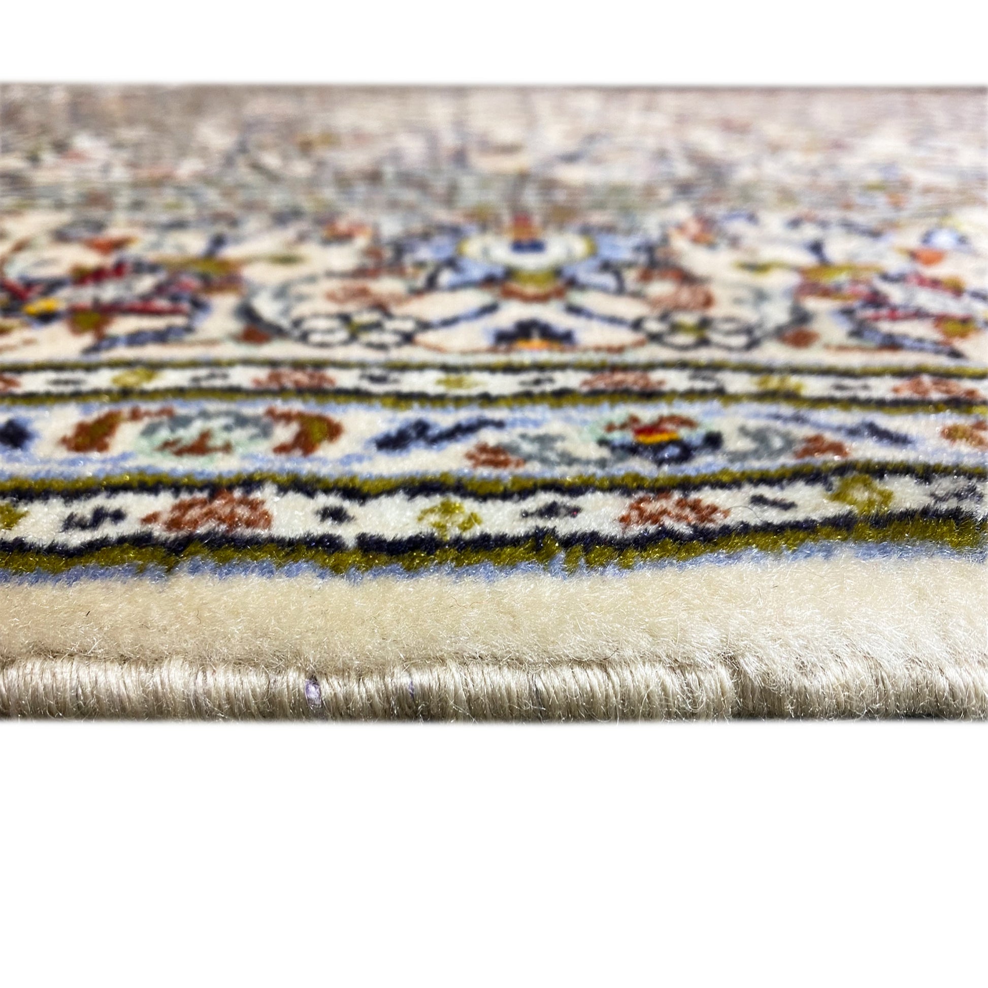 Este tapete Keshan feito à mão, fabricado com uma mistura luxuosa de lã/viscose, tem um tamanho de 294x192 cm. Apresenta um padrão clássico de medalhão e é perfeito para dar um toque elegante a estilos de decoração tradicionais e de transição. Os suaves tons bege e os motivos florais artísticos criam um ponto focal sofisticado, trazendo ao mesmo tempo calor e beleza intemporal à sua sala de estar ou de jantar.