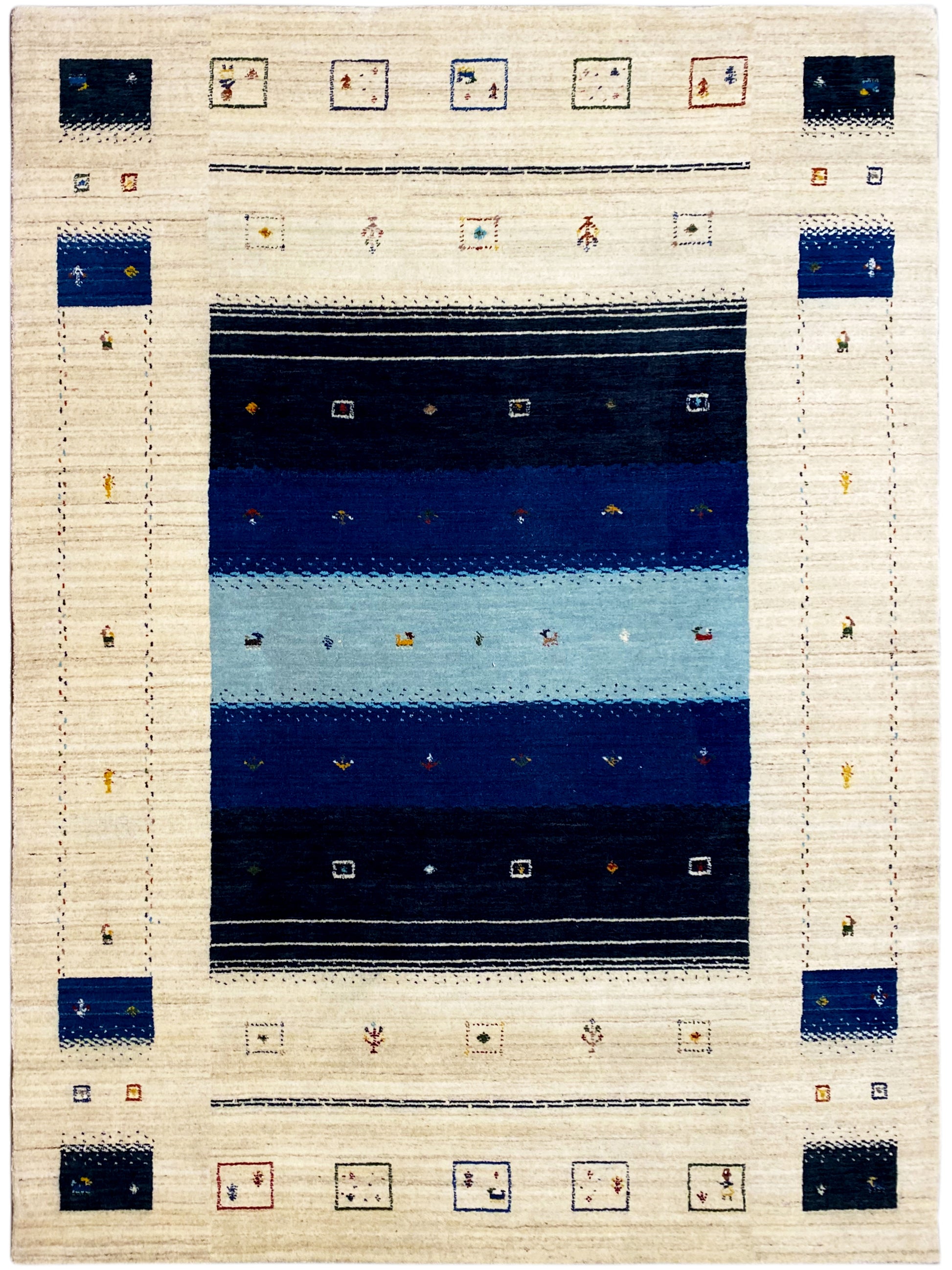 Dieser handgewebte Loom Luri Teppich aus hochwertiger Wolle überzeugt durch seine elegante Farbkombination und langlebige Qualität. Die Kombination aus Creme und verschiedenen Blautönen verleiht dem Raum eine ruhige und stilvolle Atmosphäre und passt perfekt zu modernen, skandinavischen und maritimen Wohnstilen. Das geometrisch-traditionelle Muster mit feinen, ethnischen Details sorgt für eine harmonische und strukturierte Optik. Mit seiner Größe von 241x173 cm eignet sich der Teppich ideal für Wohn- oder Essbereiche und bietet angenehmen Komfort sowie natürliche Wärme.