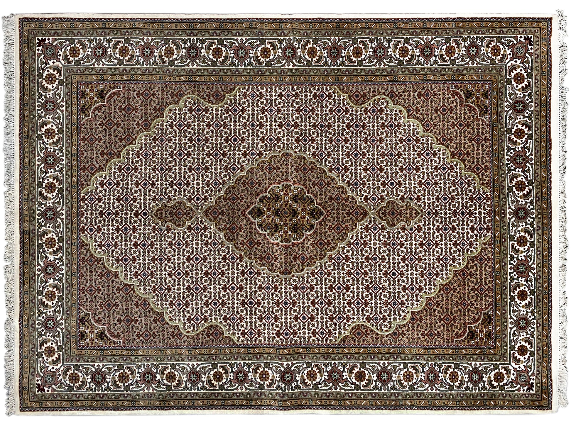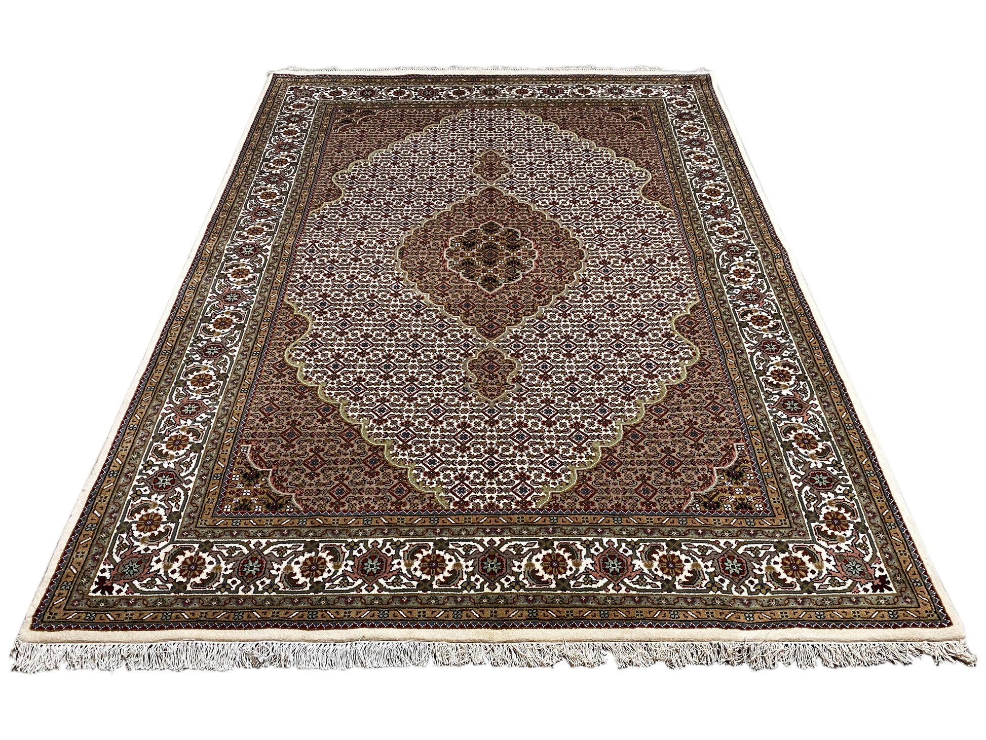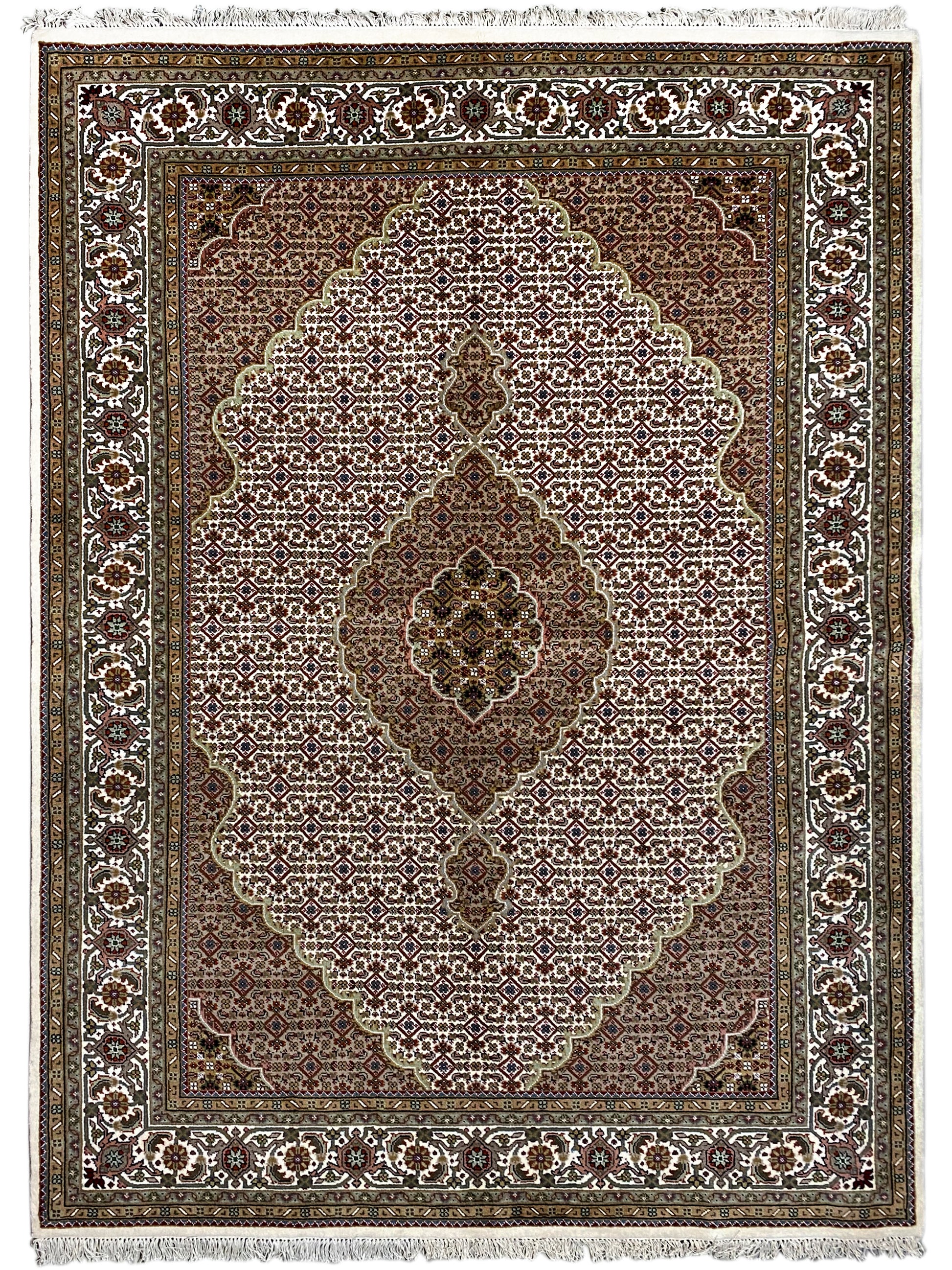 Originalmente, o Tabriz Mahi vem da Pérsia. Atualmente, estes tapetes também são feitos à mão na Índia com os mesmos padrões de qualidade. Os nossos Mahi são tapetes de alta qualidade e requinte, feitos com lã fina. Os tapetes têm cores fortes, claras e profundas e, devido ao seu bom acabamento, são muito duráveis.