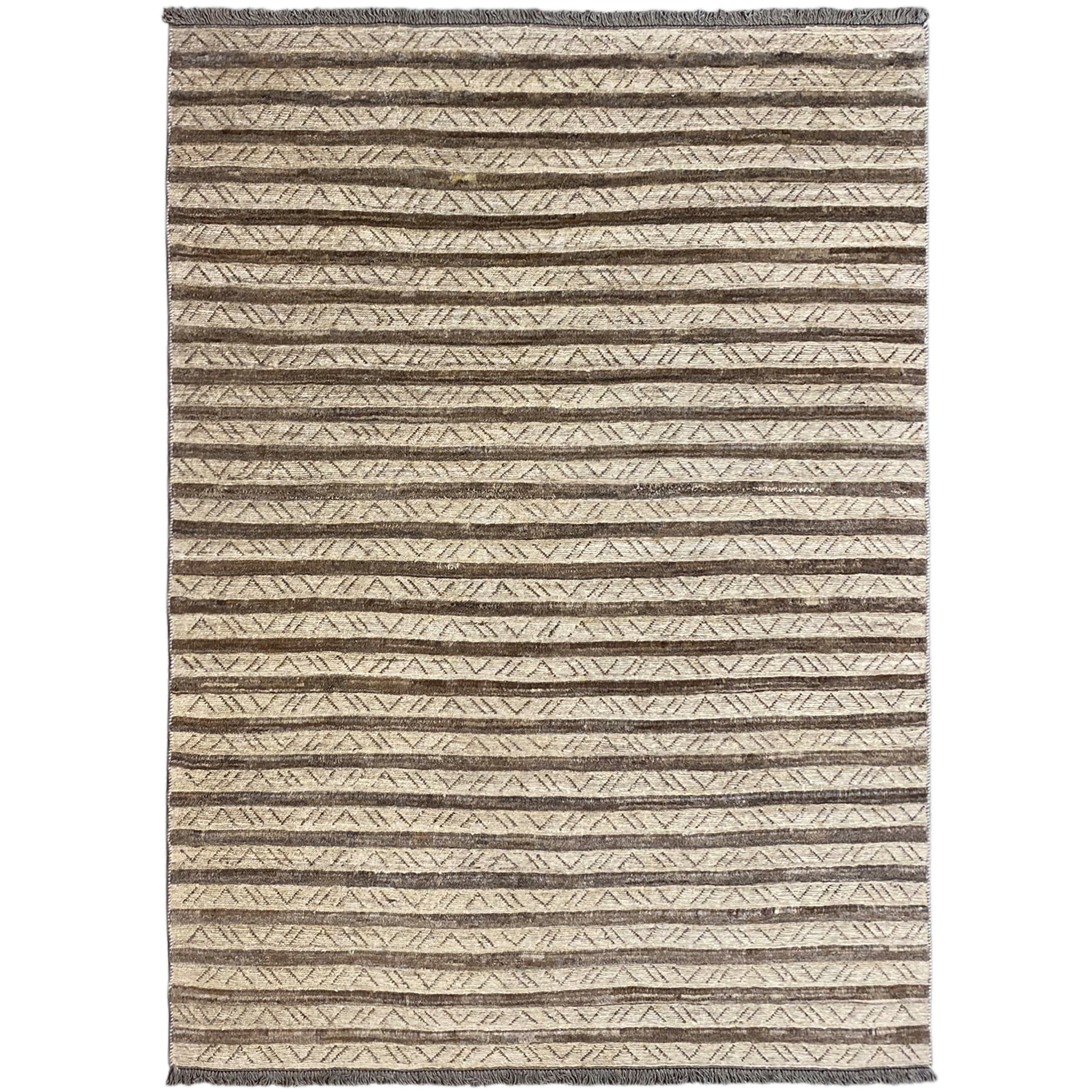 Feito de lã virgem fiada à mão e tingida com plantas, o tapete destaca-se pela sua qualidade duradoura e pelo elegante padrão de riscas em tons de bege e castanho. A harmonia das cores torna-o versátil – seja na sala de estar, no quarto ou na entrada.