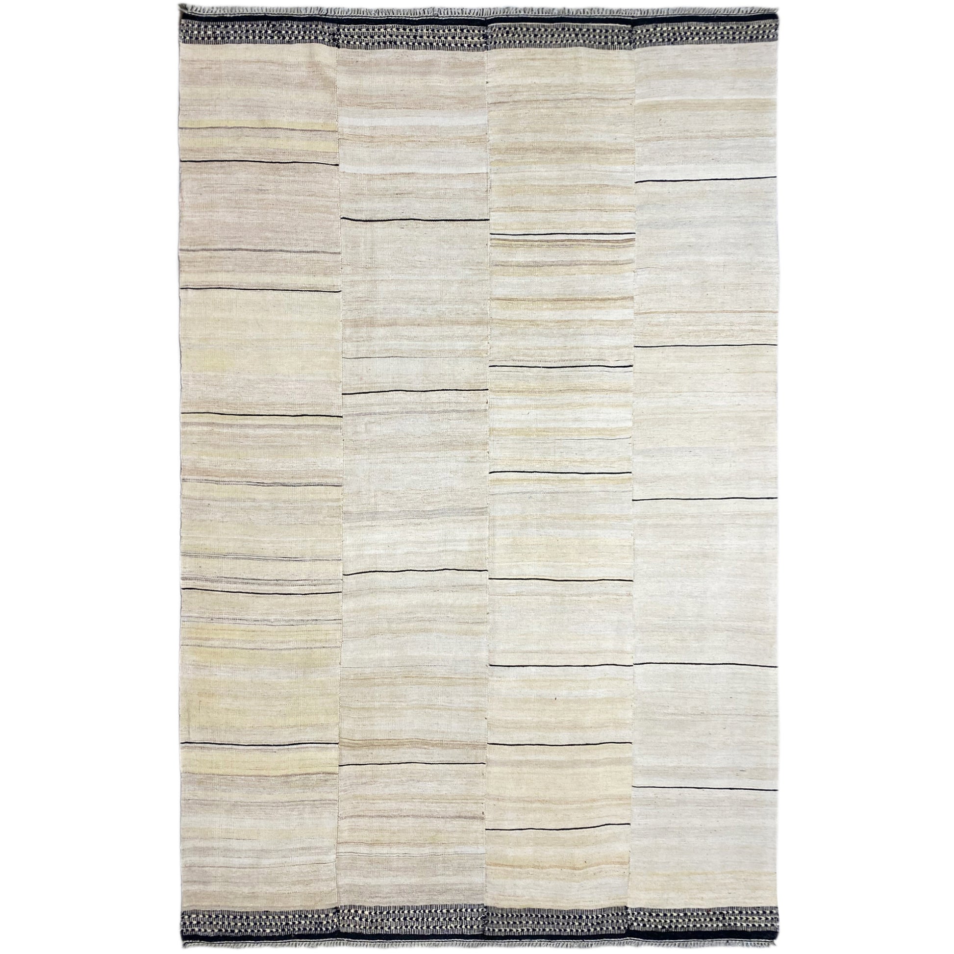 Este moderno Kelim de tecido plano, com as dimensões 318x198 cm, é um complemento elegante para qualquer interior. Fabricado com lã de alta qualidade e urdidura de algodão, oferece durabilidade e uma sensação agradável ao toque. O seu padrão único de riscas em bege e azul escuro combina na perfeição com um estilo de decoração moderno ou minimalista, criando uma atmosfera calma, mas ao mesmo tempo expressiva. Ideal para conferir a qualquer espaço uma elegância contemporânea.