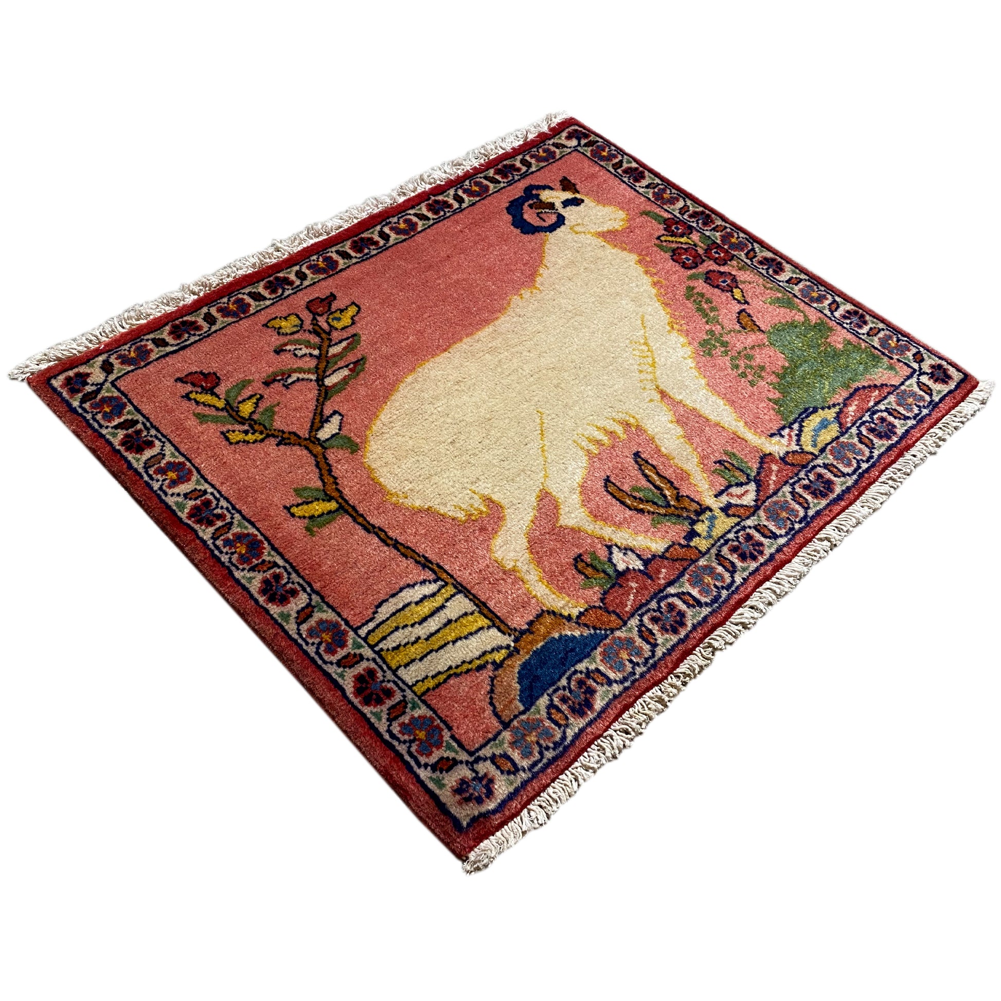 Este encantador tapete Poshti, feito à mão, é um testemunho autêntico da arte têxtil nómada do grupo tribal "Tork" do sul do Irão, conhecido pelos seus característicos tapetes "Torkey". Com as suas dimensões de 54x44 cm, esta peça em lã e algodão apresenta um suave fundo rosa antigo que serve de palco a uma proeminente e estilizada representação de um carneiro. Rodeado por encantadores elementos florais e um padrão paisagístico sugerido, este tapete é ideal para conferir a qualquer pequeno espaço ou parede um toque único, narrativo e tradicional.