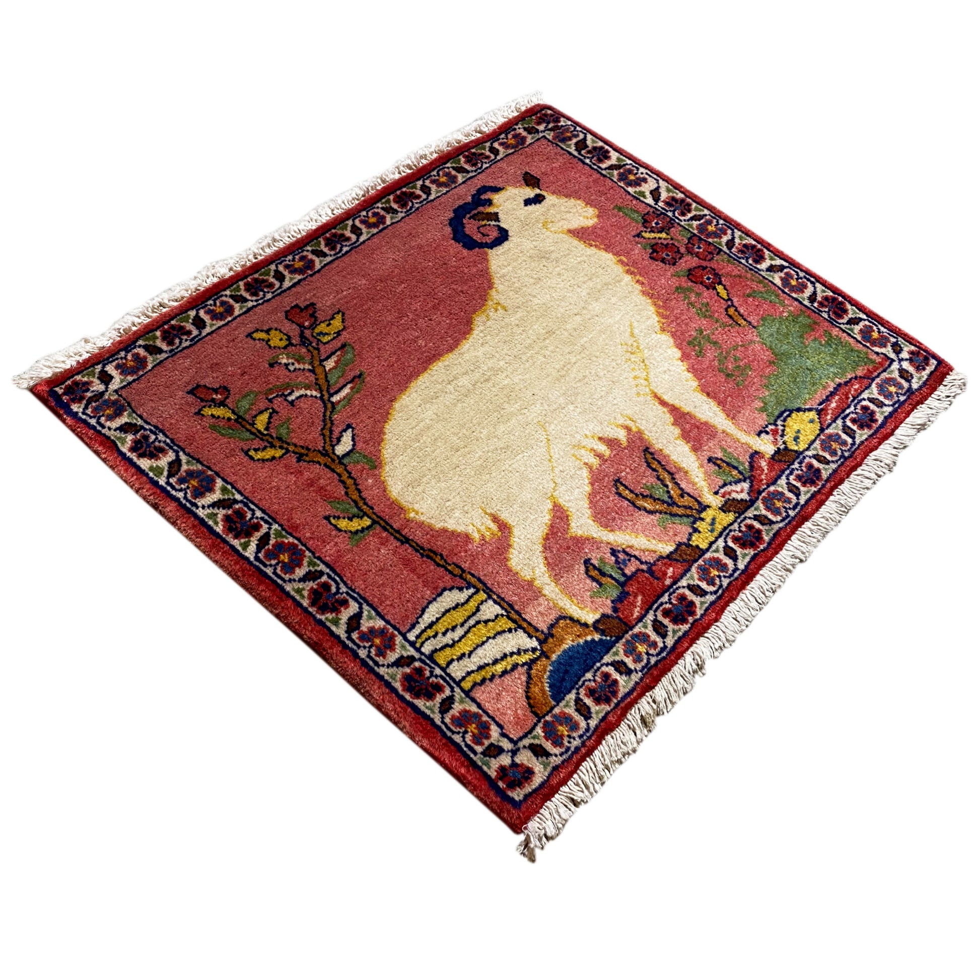 Este requintado tapete Poshti, feito à mão com nós, é um testemunho colorido da arte têxtil nómada do grupo tribal "Tork" do sul do Irão, conhecido pelos seus característicos tapetes "Torkey". Com as suas dimensões de 54x48 cm, esta peça em lã e algodão destaca-se por um fundo vermelho quente, que apresenta um padrão vibrante e uniforme de estrelas estilizadas e formas geométricas em tons variados e luminosos. Perfeito como tapete de destaque, confere a qualquer espaço pequeno ou área de parede um toque de tradição autêntica e elegância dinâmica.