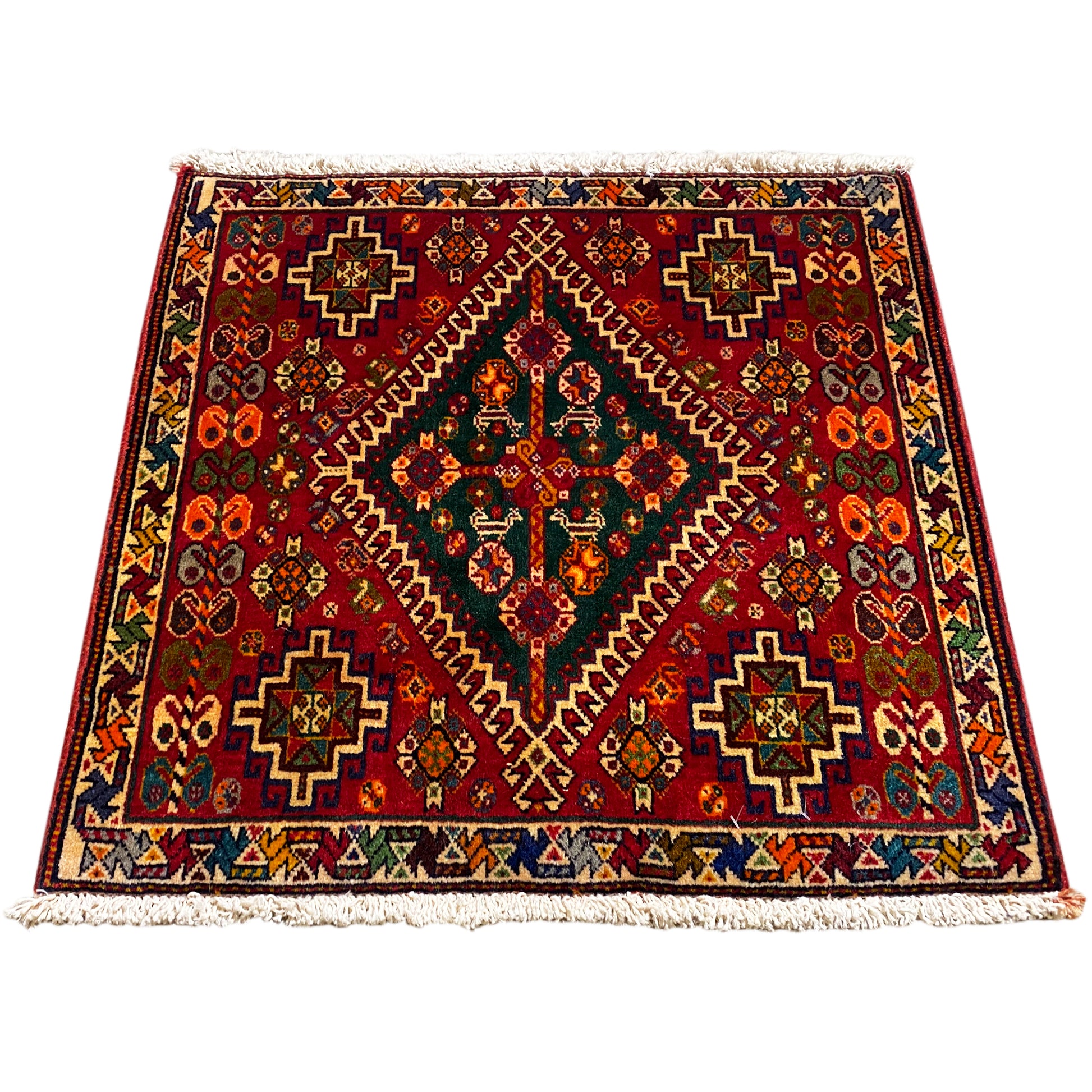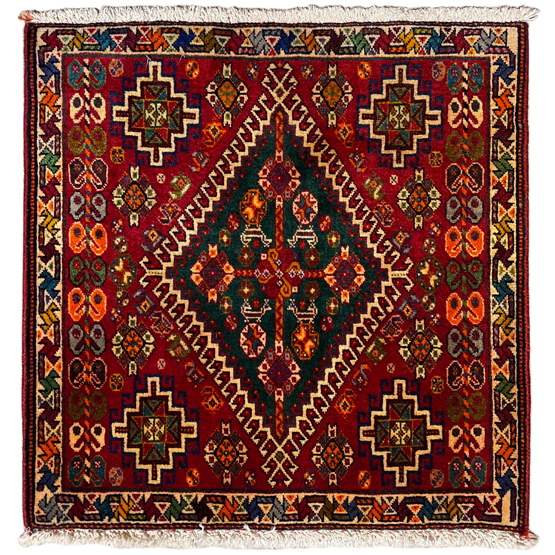 Este tapete Poshti requintado, feito à mão, é uma peça colorida de arte tradicional de tecelagem do sul do Irão, fabricado pelo habilidoso grupo tribal "Tork", que tece estes tapetes "Torkey". Com as suas dimensões de 60x59 cm, este tapete apresenta um jogo vibrante de vermelho profundo e um marcante medalhão verde em forma de losango no centro. Todo o campo está ricamente decorado com padrões geométricos complexos e tribalistas, transmitidos de geração em geração. Feito de lã e algodão, este tapete duradouro confere a qualquer espaço uma atmosfera quente e autêntica, testemunhando um artesanato intemporal.