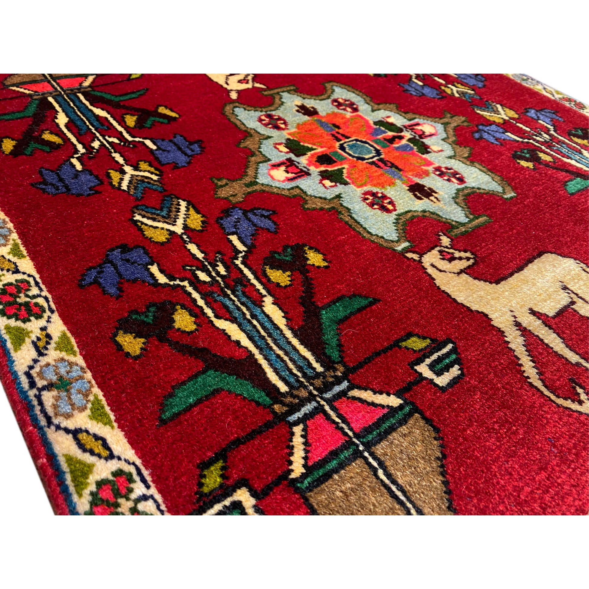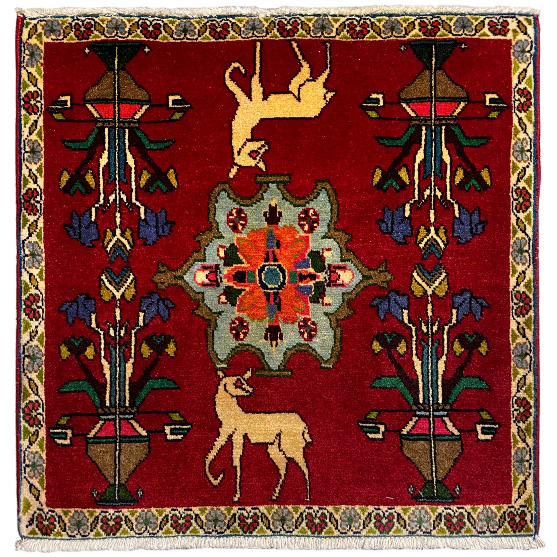 Este requintado tapete Poshti, feito à mão, é uma peça fascinante da arte têxtil do sul do Irão, criada pelo habilidoso grupo tribal "Tork", cujas criações são conhecidas como tapetes "Torkey". Com as suas dimensões de 67x64 cm, esta peça em lã e algodão apresenta um fundo vermelho vibrante, que serve de palco para um colorido medalhão central e encantadoras representações de animais. As figuras estilizadas de animais selvagens, inseridas entre elementos abstratos de árvores ou flores, conferem a este tapete uma profundidade narrativa. Ideal para amantes da decoração tradicional, traz riqueza cultural e uma atmosfera acolhedora a qualquer espaço.