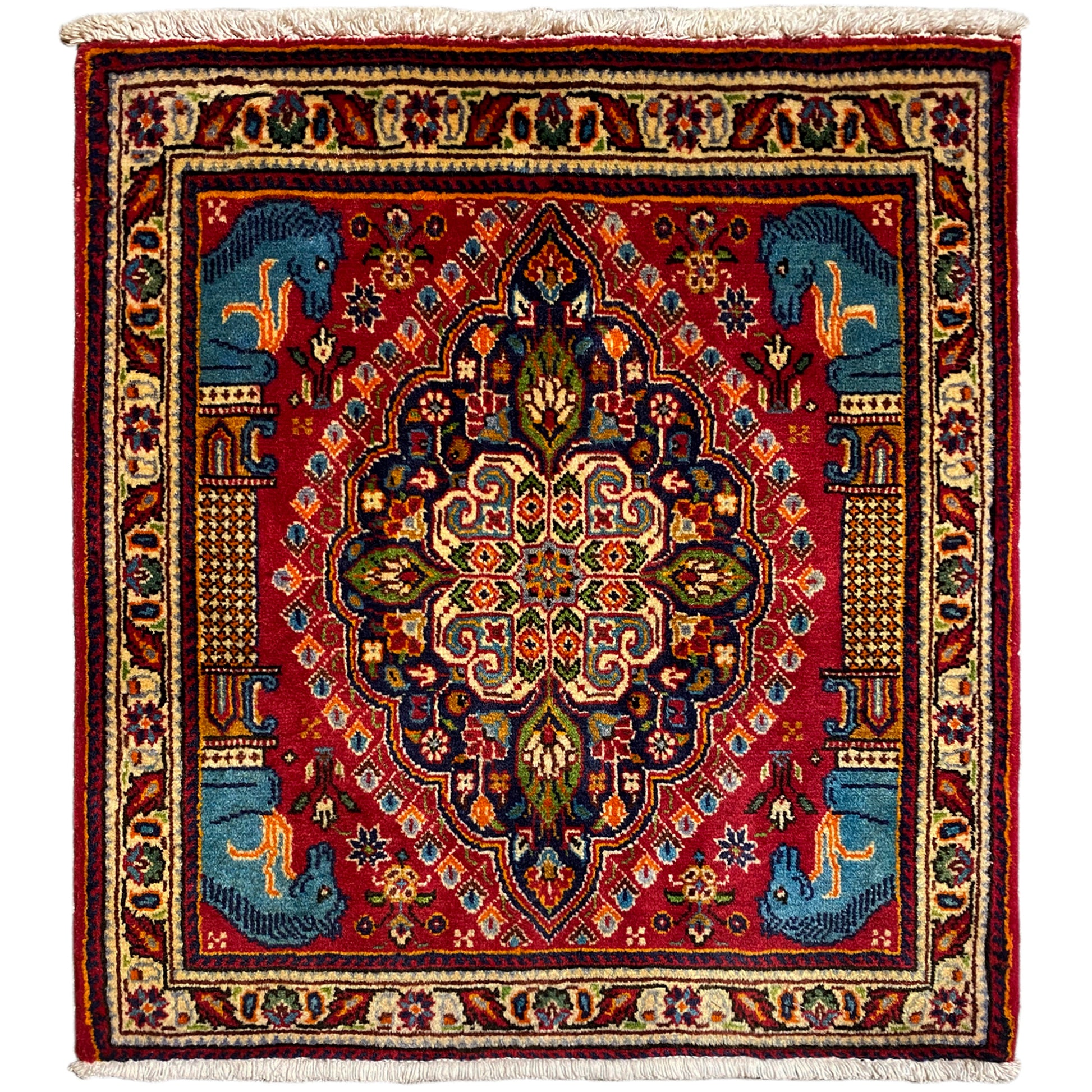 Este tapete Poshti requintado, feito à mão, em vermelho vibrante, é um exemplo autêntico do artesanato dos povos nómadas do sul do Irão. Em particular, os tapetes tecidos pelo grupo tribal "Tork" são carinhosamente chamados de "Torkey". Com as suas dimensões de 69x58 cm, esta peça é ideal para dar a qualquer espaço um toque de decoração tradicional e aconchego, realçado por um padrão detalhado de medalhão com motivos florais. O artesanato robusto em lã e algodão, bem como as cores vivas, tornam-no um acento duradouro e elegante.
