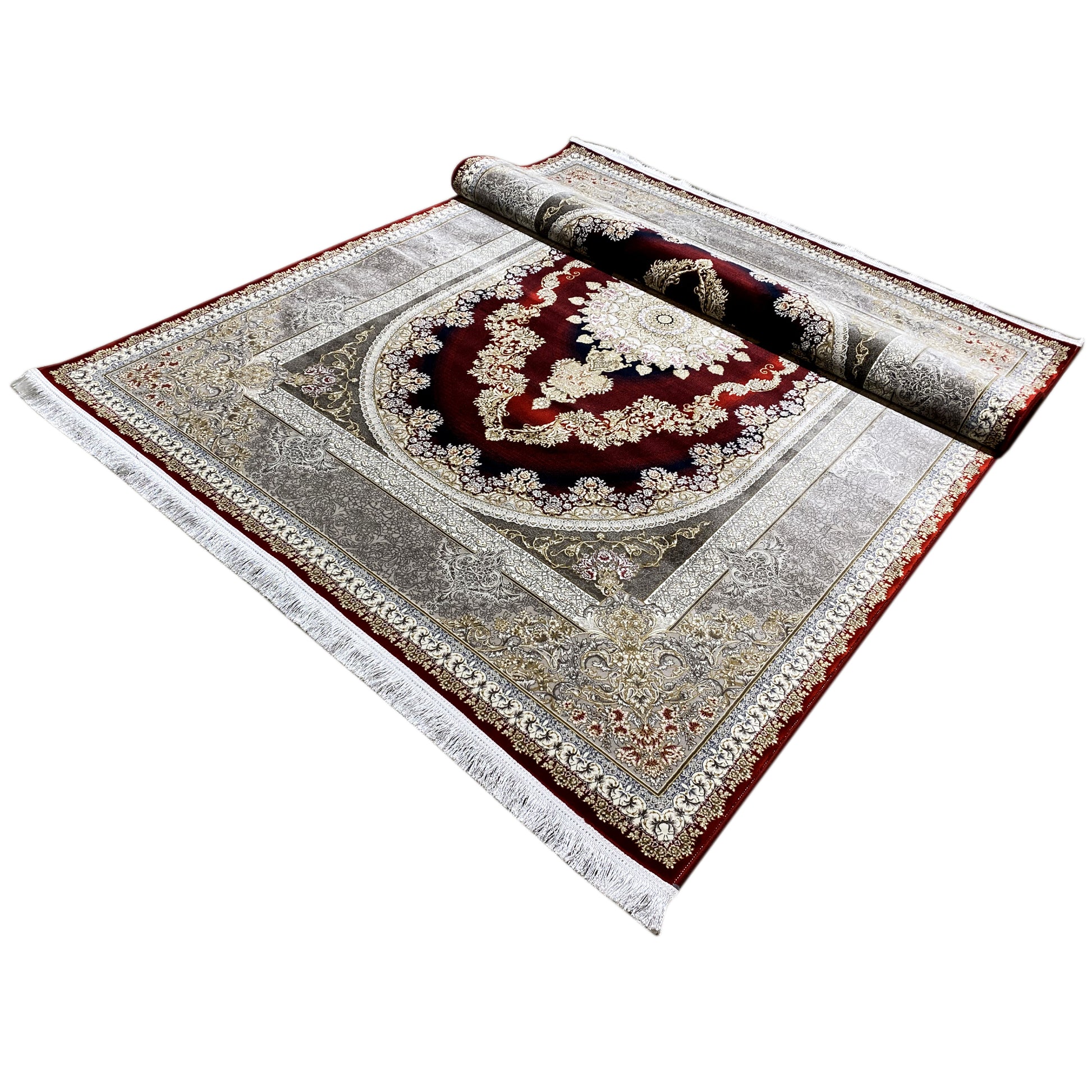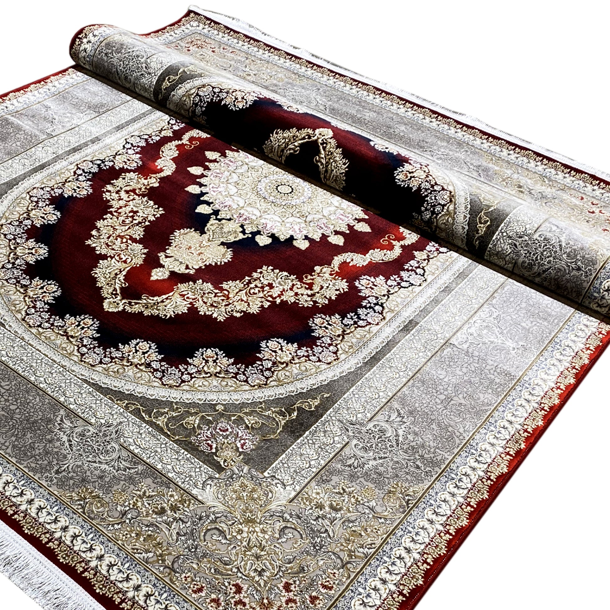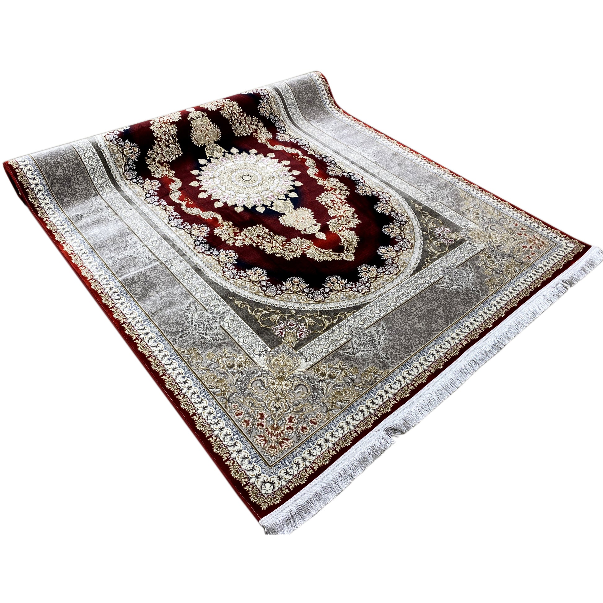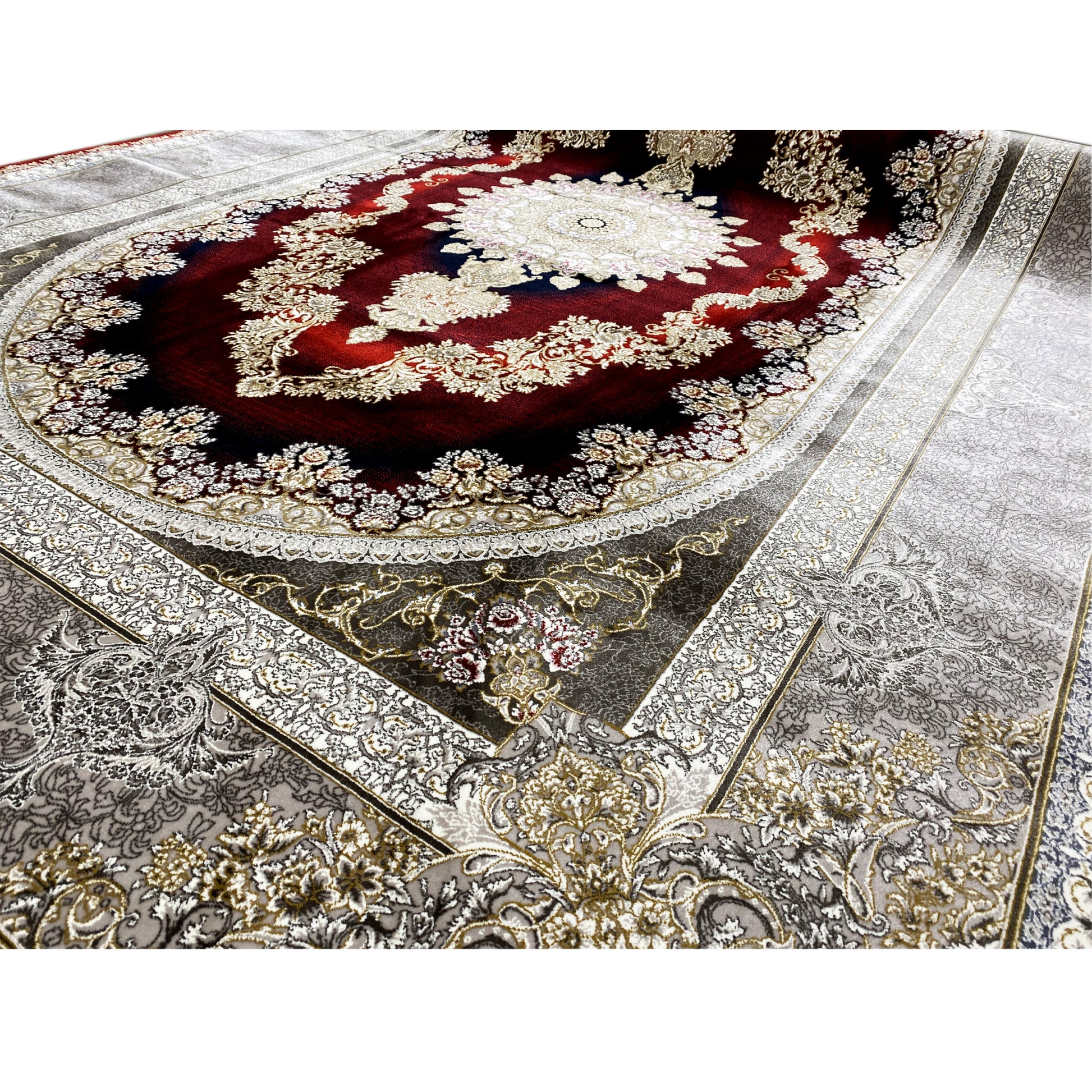 Dê ao seu lar uma elegância opulenta com este magnífico tapete clássico. O seu marcante design oval com medalhão apresenta um padrão artístico em tons profundos de vermelho e dourado, emoldurado por uma refinada borda prateada. Fabricado em 100% acrílico tratado termicamente, este tapete macio e resistente é ideal para áreas de grande circulação, combinando estilo luxuoso com durabilidade moderna. O tamanho generoso de 170x240cm torna-o a peça de destaque perfeita para a sua sala de estar ou de jantar.